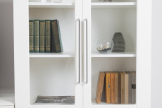 Графичное и стильное сочетание белоснежных фасадов и черных деталей эффектно расставляет акценты на мебели. Геометричный рисунок фрезеровки на белоснежных фасадах даёт развитый светотеневой рисунок. Комплектация состоит из двух комод-ТВ-тумб Валенсия 13.309, пенала Валенсия 13.218, серванта Валенсия 13.217 и двух навесных полок Валенсия 16.481. Конструктивно два комода Валенсия 13.309 объединены в единый блок и образуют широкую и вместительную ТВ-тумбу. Каждый комод с распашными дверками по бокам и тремя выдвижными ящиками в центре - вместительный и функциональный. Можно использовать как широкую ТВ-тумбу. Над комодами расположены две навесные открытые полки с задней панелью из МДФ. Полочка и задняя панель, каждой полки соединены металлическими кронштейнами черного цвета, усиливающие конструкцию и служащими креплениями к стене. Сервант и пенал объединены в единый блок, образующий стенку-библиотеку. Двухдверный сервант Валенсия 13.217 оснащен стеклянными вставками в дверях. Можно использовать как книжный шкаф и как витрину для наград, фотографий, поделок или элементов декора. За распашными дверями серванта расположены 6 полок из ЛДСП. Пенал украшен оригинальной стеклянной вставкой на фасаде, за которой расположены стеклянные полки. За дверкой пенала расположены 6 полок - четыре верхние полочки выполнены из стекла, нижние две из ЛДСП. Универсальная сборка - сторону открывания двери Вы определяете при сборке. Ящики установлены на направляющие скрытого монтажа с доводчиками. Двери закреплены на четырехшарнирных петлях. Установлена мебель на высокие ножки, что делает конструкцию лёгкой и воздушной и практичной в плане уборки. Мебель выполнена из экологически чистой ламинированной ДСП 16 мм, класса эмиссии Е1, детали обработаны ПВХ-кромкой. Фасады из МДФ с матовой ПВХ-плёнкой. Такое решение делает мебель визуально более ""мягкой"", комфортной и расслабляющей, что особенно актуально для спальни.
