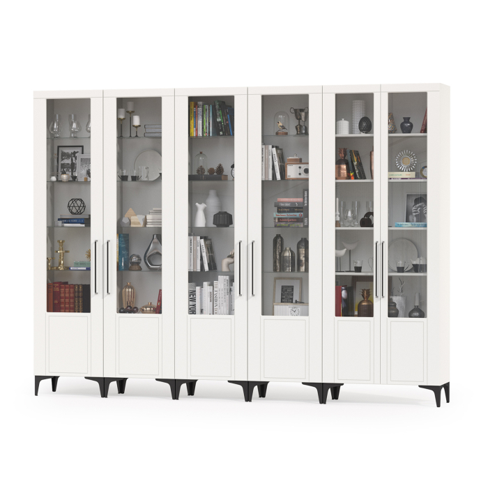 Графичное и стильное сочетание белоснежных фасадов и черных деталей эффектно расставляет акценты на мебели. Геометричный рисунок фрезеровки на белоснежных фасадах даёт развитый светотеневой рисунок. Комплектация состоит из четырех пеналов Валенсия 13.218 и серванта Валенсия 13.217 объединеных в библиотеку. Дверь каждый пенала украшена оригинальной стеклянной вставкой на фасаде, за которой расположены стеклянные полки. За дверкой каждого пенала расположены 6 полок - четыре верхние полочки выполнены из стекла, нижние две из ЛДСП. Универсальная сборка - сторону открывания двери Вы определяете при сборке. Двухдверный сервант Валенсия 13.217 оснащен стеклянными вставками в дверях. Можно использовать как книжный шкаф и как витрину для наград, фотографий, поделок или элементов декора. За распашными дверями серванта расположены 6 полок из ЛДСП. Двери закреплены на четырехшарнирных петлях. Установлена мебель на высокие ножки, что делает конструкцию лёгкой и воздушной и практичной в плане уборки. Мебель выполнена из экологически чистой ламинированной ДСП 16 мм, класса эмиссии Е1, детали обработаны ПВХ-кромкой. Фасады из МДФ с матовой ПВХ-плёнкой. Такое решение делает мебель визуально более ""мягкой"", комфортной и расслабляющей, что особенно актуально для спальни.