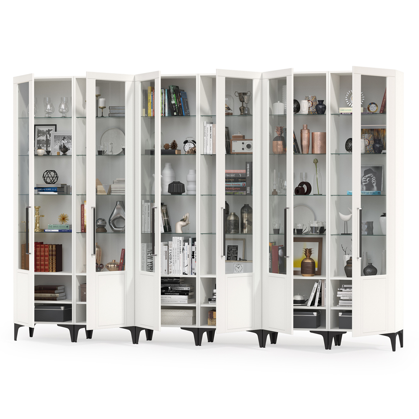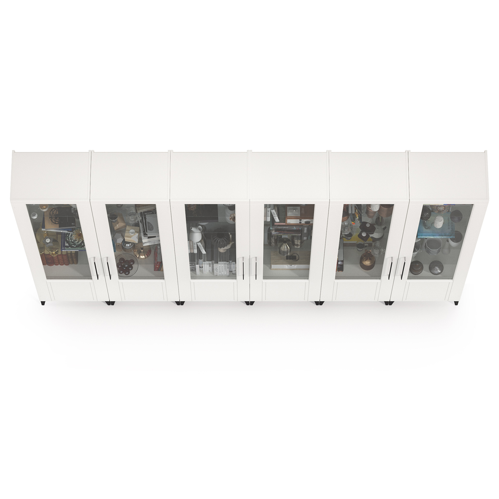 Шкафы в библиотеку - шесть дверок со стеклом Валенсия № 132 - стильный набор для светлой гостиной в популярном стиле ар-деко.