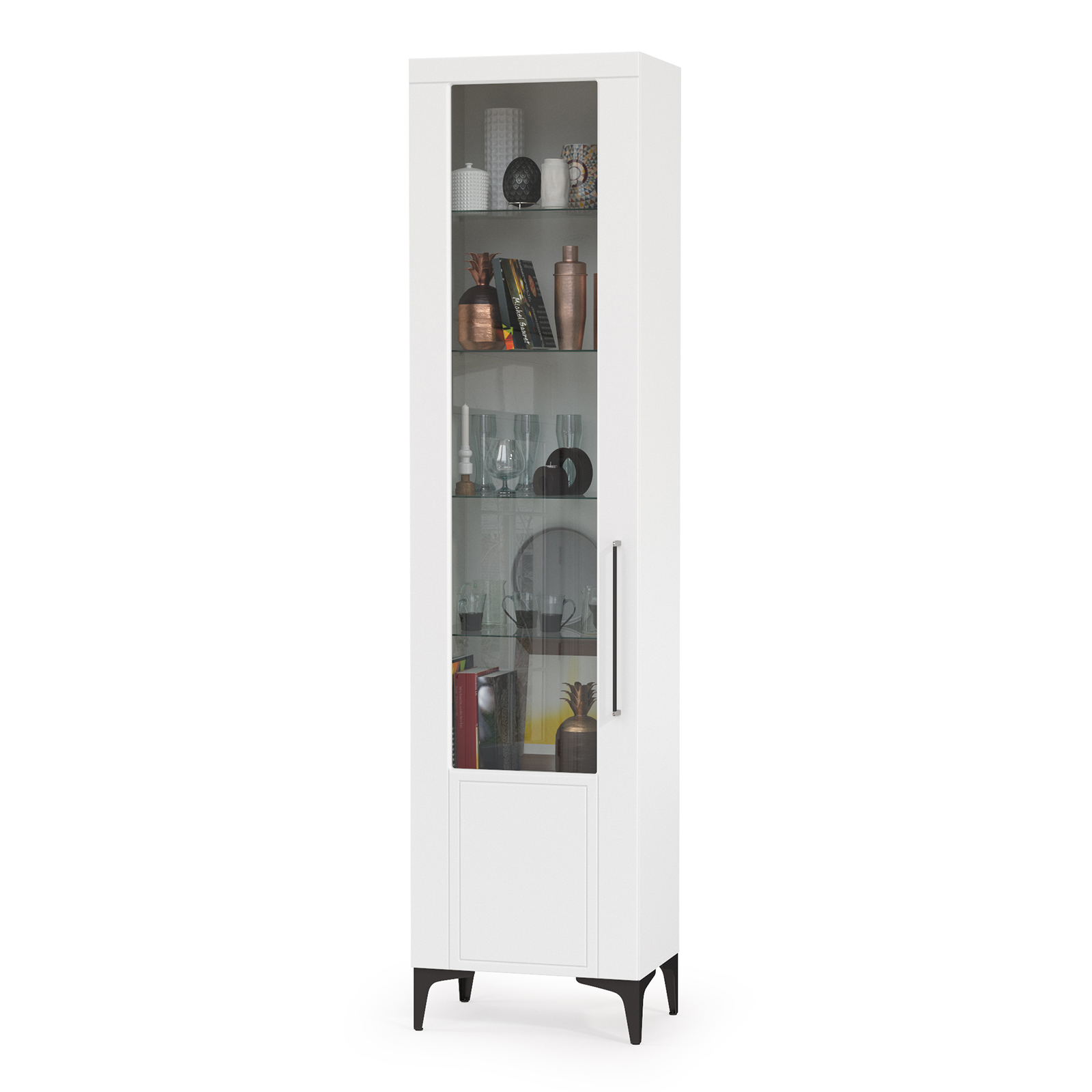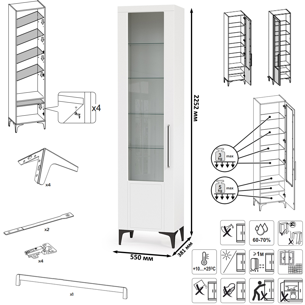Графичное и стильное сочетание белоснежных фасадов и черных деталей эффектно расставляет акценты на мебели. Геометричный рисунок фрезеровки на белоснежных фасадах даёт развитый светотеневой рисунок. Комплектация состоит из шести пеналов Валенсия 13.218 объединеных в библиотеку. Дверь каждый пенала украшена оригинальной стеклянной вставкой на фасаде, за которой расположены стеклянные полки. За дверкой каждого пенала расположены 6 полок - четыре верхние полочки выполнены из стекла, нижние две из ЛДСП. Универсальная сборка - сторону открывания двери Вы определяете при сборке. Двери закреплены на четырехшарнирных петлях. Установлена мебель на высокие ножки, что делает конструкцию лёгкой и воздушной и практичной в плане уборки. Мебель выполнена из экологически чистой ламинированной ДСП 16 мм, класса эмиссии Е1, детали обработаны ПВХ-кромкой. Фасады из МДФ с матовой ПВХ-плёнкой. Такое решение делает мебель визуально более ""мягкой"", комфортной и расслабляющей, что особенно актуально для спальни. Поставляется в разобранном виде в надёжной упаковке, с комплектом сборочной фурнитуры и инструкцией по сборке.