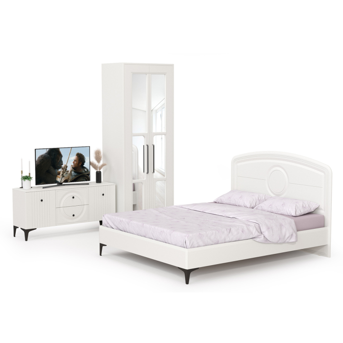 Графичное и стильное сочетание белоснежных фасадов и черных деталей эффектно расставляет акценты на мебели. Геометричный рисунок фрезеровки на белоснежных фасадах даёт развитый светотеневой рисунок. Комплектация состоит из двуспальной кровати Валенсия 11.36.01, шкафа для одежды с зеркалами Валенсия 13.291 и ТВ-тумбы Валенсия 16.45. Выбирая двуспальную кровать Валенсия 11.36.01 со спальным местом 1600х2000 мм, Вы выбираете крепкий сон и уют. Ортопедическое основание 1600х2000 мм. с гнутоклееными ламелями входит в комплект, матрас приобретаются отдельно. Углубление под матрас - 100 мм. Рекомендованная высота матраса от 100 до 220 мм. Максимально допустимая нагрузка на 1 спальное место - 100 кг. Тумба под ТВ Валенсия 16.45 оснащена двумя выдвижными ящиками по центру и нишами с полкой за распашными дверками по краям. Шкаф оборудован за распашными дверями штангой для одежды на плечиках и антресольной и нижней полками. Декор шкафа для одежды 2-х дверного решён нестандартно и интересно. Зеркало накладывается изнутри фасада, проявляя таким образом сквозную ажурную фрезеровку.</ Ящики установлены на направляющие скрытого монтажа с доводчиками. Двери закреплены на четырехшарнирных петлях. Установлена мебель на высокие ножки, что делает конструкцию лёгкой и воздушной и практичной в плане уборки. Мебель выполнена из экологически чистой ламинированной ДСП 16 мм, класса эмиссии Е1, детали обработаны ПВХ-кромкой. Фасады из МДФ с матовой ПВХ-плёнкой. Такое решение делает мебель визуально более "мягкой", комфортной и расслабляющей, что особенно актуально для спальни.