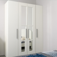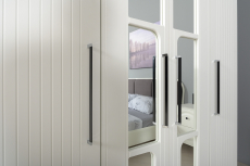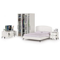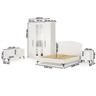 Графичное и стильное сочетание белоснежных фасадов и черных деталей эффектно расставляет акценты на мебели. Геометричный рисунок фрезеровки на белоснежных фасадах даёт развитый светотеневой рисунок. Комплектация состоит из двуспальной кровати Валенсия 11.36.01, прикроватной тумбы Валенсия 13.291, шкафа для одежды Валенсия 13.291, двух пеналов Валенсия 13.207 и ТВ-тумбы Валенсия 16.45. Выбирая двуспальную кровать Валенсия 11.36.01 со спальным местом 1600х2000 мм, Вы выбираете крепкий сон и уют. Ортопедическое основание 1600х2000 мм. с гнутоклееными ламелями входит в комплект, матрас приобретаются отдельно. Углубление под матрас - 100 мм. Рекомендованная высота матраса от 100 до 220 мм. Максимально допустимая нагрузка на 1 спальное место - 100 кг. Тумба прикроватная Валенсия 13.291 оборудована двумя удобными выдвижными ящикам. Тумба под ТВ Валенсия 16.45 оснащена двумя выдвижными ящиками по центру и нишами с полкой за распашными дверками по краям. Гардеробная композиция составлена из двух шкафов-пеналов расположенных по бокам и двухдверным шкафом по центру. 2-х дверный шкаф оборудован за распашными дверями штангой для одежды на плечиках и антресольной и нижней полками. Декор шкафа для одежды 2-х дверного решён нестандартно и интересно. Зеркало накладывается изнутри фасада, проявляя таким образом сквозную ажурную фрезеровку. Внутреннее наполнение пенала (в комплекте 2 единицы)Вы определяете сами, есть возможность расположить внутри - 5 полочек или штангу для одежлы на плечиках и две полки верхнюю и нижнюю. Пять полок внутри шкафа-пенала позволят обустроить библиотеку, а штанга для одежды с 2-мя полками - мини-гардеробную. Ящики установлены на направляющие скрытого монтажа с доводчиками. Двери закреплены на четырехшарнирных петлях. Установлена мебель на высокие ножки, что делает конструкцию лёгкой и воздушной и практичной в плане уборки. Мебель выполнена из экологически чистой ламинированной ДСП 16 мм, класса эмиссии Е1, детали обработаны ПВХ-кромкой. Фасады из МДФ с матовой ПВХ-плёнкой. Такое решение делает мебель визуально более "мягкой", комфортной и расслабляющей, что особенно актуально для спальни.