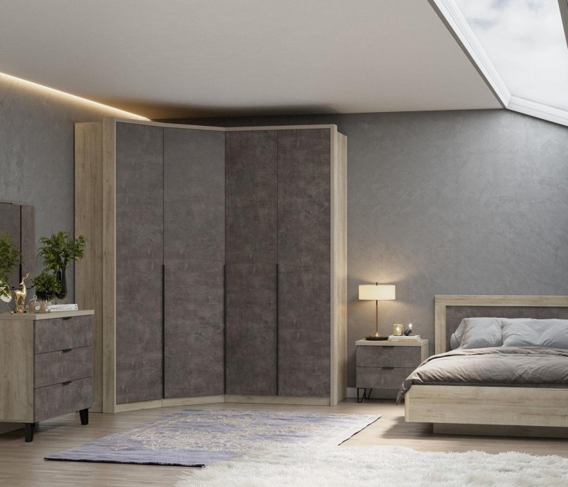 Угловой шкаф ШК-3219 Анима из комплекта модульной спальни Анима не оснащён зеркалом. Дизайн в стиле Лофт общий для всей спальни и выделяется природными текстурами дерева и камня.