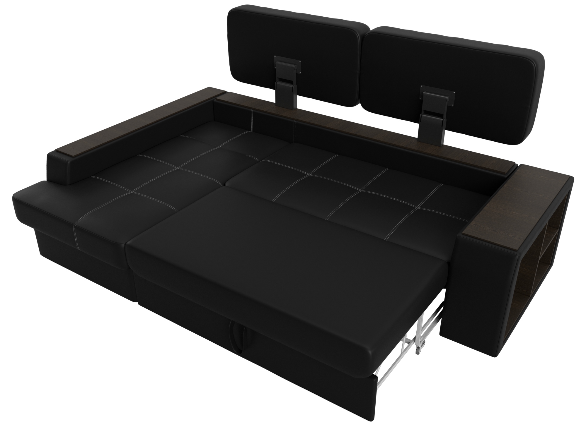 Шикарный угловой диван Брюссель удобен и функционален в использовании. Подлокотники выполняют роль мини-столиков. Одна из боковин дополнена книжными полками, декорированным «под дерево». Под длинной боковиной расположена ниша для белья. Изделие оснащено удобным механизмом трансформации в двуспальную кровать.