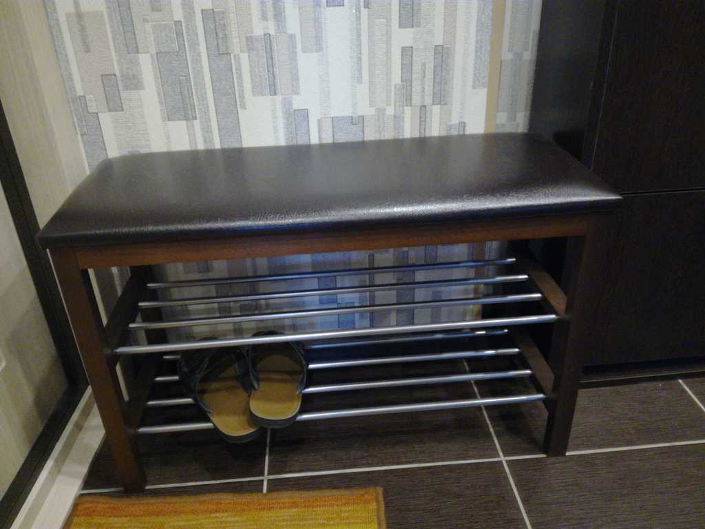 - Банкетка оснащена уютным мягким сидением и полками для размещения обуви и тапочек;
