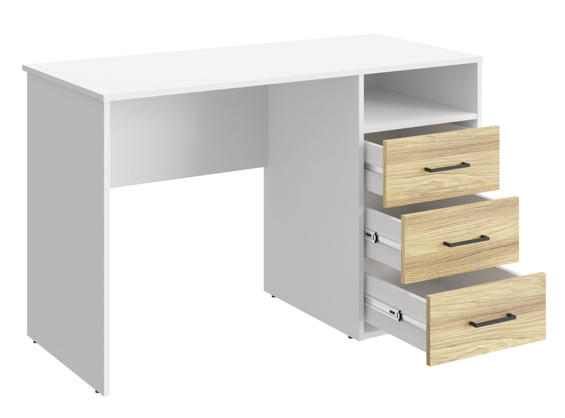 Письменный стол Оскар ОС-20 идеально подойдет для создания рабочего места в небольшом помещении. Благодаря своей универсальности стол с ящиками и нишей может использоваться как компьютерный, офисный, письменный или стол для ноутбука. С его помощью вы сможете организовать порядок на своем рабочем месте. Стол гармонично впишется в любой стиль интерьера. Современный и простой дизайн делает его идеальным для использования дома и в офисе. Свес крышки в 30 мм обеспечит прилегание к стене с любым плинтусом.