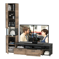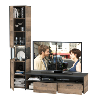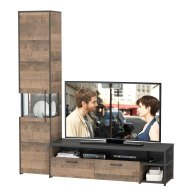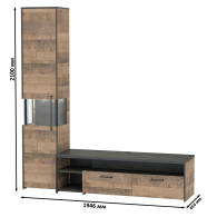 Брутальный декор и контрастная кромка, как и лицевая фурнитура придаёт мебели индустриальную эстетику. Комплектация состоит из тумбы под ТВ Трувор 13.70 и шкафа-пенала с витриной Трувор 13.205. Тумба Трувор 13.70 оснащена широкой нишей сверху и 2 выдвижными ящиками и небольшой нишей снизу. Столешница тумбы имеет по центру кабель-канал, что значительно упрощает подключение техники и проблемы с проводами. Направляющие выдвижных ящиков скрытого монтажа оснащены доводчиками, что обеспечивают повышенный комфорт и надёжность. На нижних кромках опор тумбы предусмотрены пластиковые подпятники для защиты поверхности пола от механических повреждений. Тумба под ТВ Трувор 13.70 имеет универсальную сборку, что позволяет расположить ящики как справа, так и слева. Шкаф-пенал Трувор 13.205 за распашной дверкой со стеклянной вставкой расположены 5 полочек, 2 из которых съемные. Центральная часть пенала имеет витрину с подсветкой. Светодиодная подсветка в витрине со стеклом — эффектно подчёркивает аксессуары. На нижних кромках опор шкафа-пенала предусмотрены пластиковые подпятники для защиты поверхности пола от механических повреждений. Шкаф-пенал с витриной имеет универсальную сборку, сторону открывания двери Вы определяете при сборке. Четырёхшарнирные петли двери оснащены доводчиками, что обеспечивают повышенный комфорт и надёжность. Металлические элементы делают эту мебель надёжной, аутентичной и функциональной. Выполнена мебель из ламинированной ДСП 16 мм и металлических элементов, торцы окромлены ПХВ плёнкой 0,4 мм. В производстве мебели использована современная фурнитура, отличающаяся высокой надёжностью и долговечностью. Поставляется в разобранном виде в надёжной упаковке, с комплектом сборочной фурнитуры и инструкцией по сборке.