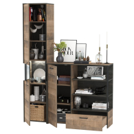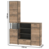 Брутальный декор и контрастная кромка, как и лицевая фурнитура придаёт мебели индустриальную эстетику. Комплектация состоит из шкафа-пенала с витриной Трувор 13.205 и комода с дверкой Трувор 13.307.01. Вместительный комод оснащен 2 полками за распашной дверкой с одной стороны и 3 открытыми нишами и выдвижным ящиком снизу с другой. Направляющие выдвижных ящиков скрытого монтажа и четырёхшарнирные петли дверки оснащены доводчиками, что обеспечивают повышенный комфорт и надёжность. Комод Трувор 13.307.01 имеет универсальную сборку, что позволяет расположить дверку как справа, так и слева. На нижних кромках опор комода предусмотрены пластиковые подпятники для защиты поверхности пола от механических повреждений. Металлические элементы делают эту мебель надёжной, аутентичной и функциональной. Шкаф-пенал Трувор 13.205 за распашной дверкой со стеклянной вставкой расположены 5 полочек, 2 из которых съемные. Центральная часть пенала имеет витрину с подсветкой. Светодиодная подсветка в витрине со стеклом — эффектно подчёркивает аксессуары. На нижних кромках опор шкафа-пенала предусмотрены пластиковые подпятники для защиты поверхности пола от механических повреждений. Шкаф-пенал с витриной имеет универсальную сборку, сторону открывания двери Вы определяете при сборке. Четырёхшарнирные петли двери оснащены доводчиками, что обеспечивают повышенный комфорт и надёжность. Выполнена мебель из ламинированной ДСП 16 мм и металлических элементов, торцы окромлены ПХВ плёнкой 0,4 мм. В производстве мебели использована современная фурнитура, отличающаяся высокой надёжностью и долговечностью. Поставляется в разобранном виде в надёжной упаковке, с комплектом сборочной фурнитуры и инструкцией по сборке.