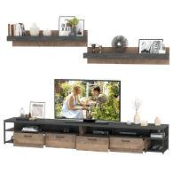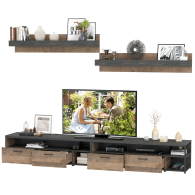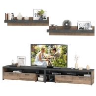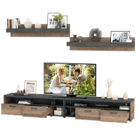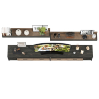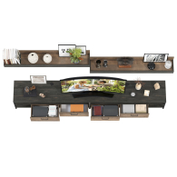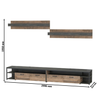 Брутальный декор и контрастная кромка, как и лицевая фурнитура придаёт мебели индустриальную эстетику. Комплектация состоит из двух тумб под ТВ Трувор 13.70 и двух полок навесных Трувор 15.60. Две тумбы ТВ объединенны в широкую низкую тумбу. Каждая тумба оснащена широкой нишей сверху и 2 выдвижными ящиками и небольшой нишей снизу. Столешница тумбы имеет по центру кабель-канал, что значительно упрощает подключение техники и проблемы с проводами. Направляющие выдвижных ящиков скрытого монтажа оснащены доводчиками, что обеспечивают повышенный комфорт и надёжность. На нижних кромках опор тумбы предусмотрены пластиковые подпятники для защиты поверхности пола от механических повреждений. Тумба под ТВ Трувор 13.70 имеет универсальную сборку, что позволяет расположить ящики как справа, так и слева. Металлические элементы делают этот стол надёжным, аутентичнымй и функциональным. Над тумбами расположены две классические навесные открытые полки с задней панелью. Полки располагаются по центру панелей и оборудованы бортиками. Полки Трувор 15.60 можно использовать как книжные, а также для размещения элементов декора, поделок и фотографий. Полки имеют с обратной стороны панели скрытые крепленния. Максимальная нагрузка на каждую полку составляет 3 кг. Выполнена мебель из ламинированной ДСП 16 мм и металлических элементов, торцы окромлены ПХВ плёнкой 0,4 мм. В производстве мебели использована современная фурнитура, отличающаяся высокой надёжностью и долговечностью. Поставляется в разобранном виде в надёжной упаковке, с комплектом сборочной фурнитуры и инструкцией по сборке.