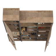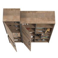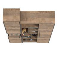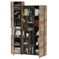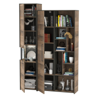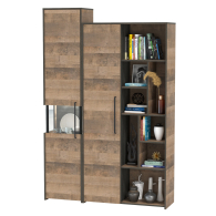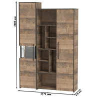 Брутальный декор и контрастная кромка, как и лицевая фурнитура придаёт мебели индустриальную эстетику. Комплектация состоит из шкафа-пенала с витриной Трувор 13.205 и шкафа-стеллажа Трувор 13.206. Шкаф-пенал Трувор 13.205 за распашной дверкой со стеклянной вставкой расположены 5 полочек, 2 из которых съемные. Пенал имеет витрину с подсветкой. Светодиодная подсветка в витрине со стеклом — эффектно подчёркивает аксессуары. На нижних кромках опор шкафа-пенала предусмотрены пластиковые подпятники для защиты поверхности пола от механических повреждений. Шкаф-пенал с витриной имеет универсальную сборку, сторону открывания двери Вы определяете при сборке. Четырёхшарнирные петли двери оснащены доводчиками, что обеспечивают повышенный комфорт и надёжность. Шкаф-стеллаж состоит из двух отделений - с одной стороны с дверкой, с другой с открытыми полками. За распашной дверкой расположены 4 полки, дверь оборудована широкой ручкой. Открытое отделение с открытыми имеет сверху и снизу большие ниши и по центру 6 ниш поменьше. Шкаф-стеллаж Трувор 13.206 имеет универсальную сборку, сторону открывания двери и ее расположение Вы определяете при сборке. Четырёхшарнирные петли двери оснащены доводчиками, что обеспечивают повышенный комфорт и надёжность. На нижних кромках шкафа предусмотрены пластиковые подпятники для защиты поверхности пола от механических повреждений. Выполнена мебель из ламинированной ДСП 16 мм и металлических элементов, торцы окромлены ПХВ плёнкой 0,4 мм. В производстве мебели использована современная фурнитура, отличающаяся высокой надёжностью и долговечностью. Поставляется в разобранном виде в надёжной упаковке, с комплектом сборочной фурнитуры и инструкцией по сборке.