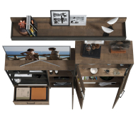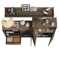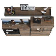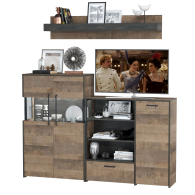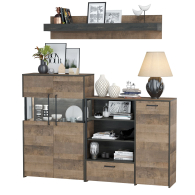 Брутальный декор и контрастная кромка, как и лицевая фурнитура придаёт мебели индустриальную эстетику. Комплектация состоит из полки навесной Трувор 15.60, комода с дверкой Трувор 13.307.01 и комода с витриной Трувор 13.306. Вместительный комод оснащен 2 полками за распашной дверкой с одной стороны и 3 открытыми нишами и выдвижным ящиком снизу с другой. Направляющие выдвижных ящиков скрытого монтажа и четырёхшарнирные петли дверки оснащены доводчиками, что обеспечивают повышенный комфорт и надёжность. Комод Трувор 13.307.01 имеет универсальную сборку, что позволяет расположить дверку как справа, так и слева. На нижних кромках опор комода предусмотрены пластиковые подпятники для защиты поверхности пола от механических повреждений. Металлические элементы делают эту мебель надёжной, аутентичной и функциональной. За распашными дверками комода со стеклянными вставками расположены 3 полки. Центральная часть комода имеет витрину с подсветкой. Светодиодная подсветка в витрине со стеклом — эффектно подчёркивает аксессуары. На нижних кромках опор комода предусмотрены пластиковые подпятники для защиты поверхности пола от механических повреждений. Четырёхшарнирные петли дверей оснащены доводчиками, что обеспечивают повышенный комфорт и надёжность. Над комодом располагается классическая навесная открытая полка с задней панелью. Полка располагается по центру панели и оборудована бортиком. Полку Трувор 15.60 можно использовать как книжную, а также для размещения элементов декора, поделок и фоторгафий. Полка имеет с обратной стороны панели скрытые крепленния. Максимальная нагрузка на полку составляет 3 кг. Выполнена мебель из ламинированной ДСП 16 мм и металлических элементов, торцы окромлены ПХВ плёнкой 0,4 мм. В производстве мебели использована современная фурнитура, отличающаяся высокой надёжностью и долговечностью. Поставляется в разобранном виде в надёжной упаковке, с комплектом сборочной фурнитуры и инструкцией по сборке.