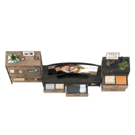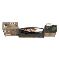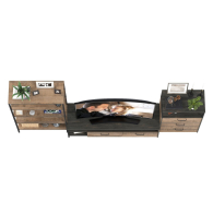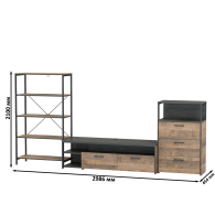 Брутальный декор и контрастная кромка, как и лицевая фурнитура придаёт мебели индустриальную эстетику. Комплектация состоит из тумбы под ТВ Трувор 13.70, стеллажа Трувор 13.151.01 и комода с ящиками Трувор 13.307.02. Тумба Трувор 13.70 оснащена широкой нишей сверху и 2 выдвижными ящиками и небольшой нишей снизу. Столешница тумбы имеет по центру кабель-канал, что значительно упрощает подключение техники и проблемы с проводами. Направляющие выдвижных ящиков скрытого монтажа оснащены доводчиками, что обеспечивают повышенный комфорт и надёжность. На нижних кромках опор тумбы предусмотрены пластиковые подпятники для защиты поверхности пола от механических повреждений. Тумба под ТВ Трувор 13.70 имеет универсальную сборку, что позволяет расположить ящики как справа, так и слева. Металлические элементы делают эту мебель надёжной, аутентичной и функциональной. Аккуратный комод оснащен 3 выдвижными ящиками и открытой нишей сверху. Направляющие выдвижных ящиков скрытого монтажа оснащены доводчиками, что обеспечивают повышенный комфорт и надёжность. На нижних кромках опор комода предусмотрены пластиковые подпятники для защиты поверхности пола от механических повреждений. Металлические элементы делают эту мебель надёжной, аутентичной и функциональной. Устойчивый стеллаж Трувор 13.151.01 с 4 полками с возможность доступа с любой стороны. Металлические стойки с регулируемыми опорами делают этот стеллаж надёжным, аутентичнымй и функциональным. Использование крестовых металлических стяжек вместо задней стенки делает конструкцию лёгкой, воздушной и устойчивой к боковым нагрузкам. Выполнена мебель из ламинированной ДСП 16 мм и металлических элементов, торцы окромлены ПХВ плёнкой 0,4 мм. В производстве мебели использована современная фурнитура, отличающаяся высокой надёжностью и долговечностью. Поставляется в разобранном виде в надёжной упаковке, с комплектом сборочной фурнитуры и инструкцией по сборке.