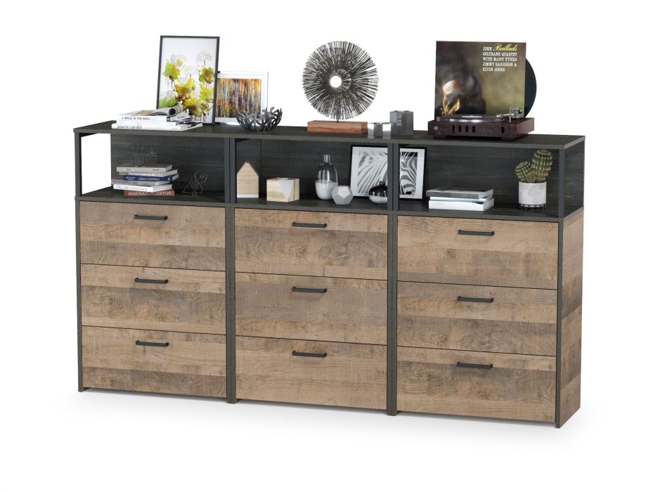 Брутальный декор и контрастная кромка, как и лицевая фурнитура придаёт мебели индустриальную эстетику. Комплектация состоит из трех комодов с ящиками Трувор 13.307.02. Аккуратный комод оснащен 3 выдвижными ящиками и открытой нишей сверху. В комп. 3 ед.. Направляющие выдвижных ящиков скрытого монтажа оснащены доводчиками, что обеспечивают повышенный комфорт и надёжность. На нижних кромках опор комода предусмотрены пластиковые подпятники для защиты поверхности пола от механических повреждений. Металлические элементы делают эту мебель надёжной, аутентичной и функциональной. Выполнена мебель из ламинированной ДСП 16 мм и металлических элементов, торцы окромлены ПХВ плёнкой 0,4 мм. В производстве мебели использована современная фурнитура, отличающаяся высокой надёжностью и долговечностью. Поставляется в разобранном виде в надёжной упаковке, с комплектом сборочной фурнитуры и инструкцией по сборке.
