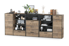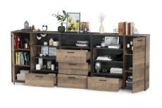 Брутальный декор и контрастная кромка, как и лицевая фурнитура придаёт мебели индустриальную эстетику. Комплектация состоит из двух комодов с дверкой Трувор 13.307.01 и комода с ящиками Трувор 13.307.02. Вместительный комод оснащен 2 полками за распашной дверкой с одной стороны и 3 открытыми нишами и выдвижным ящиком снизу с другой. В комп. 2 ед.. Комод Трувор 13.307.01 имеет универсальную сборку, что позволяет расположить дверку как справа, так и слева. Аккуратный комод оснащен 3 выдвижными ящиками и открытой нишей сверху. Направляющие выдвижных ящиков скрытого монтажа оснащены доводчиками, что обеспечивают повышенный комфорт и надёжность. На нижних кромках опор комода предусмотрены пластиковые подпятники для защиты поверхности пола от механических повреждений. Металлические элементы делают эту мебель надёжной, аутентичной и функциональной. Выполнена мебель из ламинированной ДСП 16 мм и металлических элементов, торцы окромлены ПХВ плёнкой 0,4 мм. В производстве мебели использована современная фурнитура, отличающаяся высокой надёжностью и долговечностью. Поставляется в разобранном виде в надёжной упаковке, с комплектом сборочной фурнитуры и инструкцией по сборке.