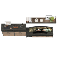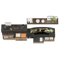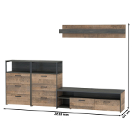 Брутальный декор и контрастная кромка, как и лицевая фурнитура придаёт мебели индустриальную эстетику. Комплектация состоит из тумбы под ТВ Трувор 13.70, полки навесной Трувор 15.60 и двух комодов с ящиками Трувор 13.307.02. Тумба Трувор 13.70 оснащена широкой нишей сверху и 2 выдвижными ящиками и небольшой нишей снизу. Столешница тумбы имеет по центру кабель-канал, что значительно упрощает подключение техники и проблемы с проводами. Тумба под ТВ Трувор 13.70 имеет универсальную сборку, что позволяет расположить ящики как справа, так и слева. Классическая навесная открытая полка с задней панелью расположена над тумбой. Полка располагается по центру панели и оборудована бортиком. Полку Трувор 15.60 можно использовать как книжную, а также для размещения элементов декора, поделок и фоторгафий. Полка имеет с обратной стороны панели скрытые крепленния. Максимальная нагрузка на полку составляет 3 кг. Аккуратный комод оснащен 3 выдвижными ящиками и открытой нишей сверху. В комп. 2 ед.. Направляющие выдвижных ящиков скрытого монтажа оснащены доводчиками, что обеспечивают повышенный комфорт и надёжность. На нижних кромках опор предусмотрены пластиковые подпятники для защиты поверхности пола от механических повреждений. Металлические элементы делают эту мебель надёжной, аутентичной и функциональной. Выполнена мебель из ламинированной ДСП 16 мм и металлических элементов, торцы окромлены ПХВ плёнкой 0,4 мм. В производстве мебели использована современная фурнитура, отличающаяся высокой надёжностью и долговечностью. Поставляется в разобранном виде в надёжной упаковке, с комплектом сборочной фурнитуры и инструкцией по сборке.