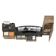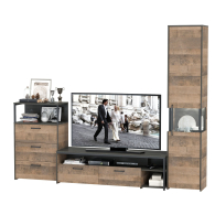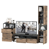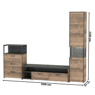 Брутальный декор и контрастная кромка, как и лицевая фурнитура придаёт мебели индустриальную эстетику. Комплектация состоит из тумбы под ТВ Трувор 13.70, комода с ящиками Трувор 13.307.02 и шкафа-пенала с витриной Трувор 13.205. Тумба Трувор 13.70 оснащена широкой нишей сверху и 2 выдвижными ящиками и небольшой нишей снизу. Столешница тумбы имеет по центру кабель-канал, что значительно упрощает подключение техники и проблемы с проводами. Тумба под ТВ Трувор 13.70 имеет универсальную сборку, что позволяет расположить ящики как справа, так и слева. Аккуратный комод оснащен 3 выдвижными ящиками и открытой нишей сверху. Направляющие выдвижных ящиков скрытого монтажа оснащены доводчиками, что обеспечивают повышенный комфорт и надёжность. На нижних кромках опор предусмотрены пластиковые подпятники для защиты поверхности пола от механических повреждений. Металлические элементы делают эту мебель надёжной, аутентичной и функциональной. Шкаф-пенал Трувор 13.205 за распашной дверкой со стеклянной вставкой расположены 5 полочек, 2 из которых съемные. Пенал имеет витрину с подсветкой. Светодиодная подсветка в витрине со стеклом — эффектно подчёркивает аксессуары. На нижних кромках опор шкафа-пенала предусмотрены пластиковые подпятники для защиты поверхности пола от механических повреждений. Шкаф-пенал с витриной имеет универсальную сборку, сторону открывания двери Вы определяете при сборке. Четырёхшарнирные петли двери оснащены доводчиками, что обеспечивают повышенный комфорт и надёжность. Выполнена мебель из ламинированной ДСП 16 мм и металлических элементов, торцы окромлены ПХВ плёнкой 0,4 мм. В производстве мебели использована современная фурнитура, отличающаяся высокой надёжностью и долговечностью. Поставляется в разобранном виде в надёжной упаковке, с комплектом сборочной фурнитуры и инструкцией по сборке.