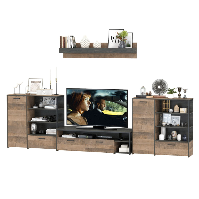 Брутальный декор и контрастная кромка, как и лицевая фурнитура придаёт мебели индустриальную эстетику. Комплектация состоит из тумбы под ТВ Трувор 13.70, полки навесной Трувор 15.60 и двух комодов с дверкой Трувор 13.307.01. Тумба Трувор 13.70 оснащена широкой нишей сверху и 2 выдвижными ящиками и небольшой нишей снизу. Столешница тумбы имеет по центру кабель-канал, что значительно упрощает подключение техники и проблемы с проводами. Тумба под ТВ Трувор 13.70 имеет универсальную сборку, что позволяет расположить ящики как справа, так и слева. Классическая навесная открытая полка с задней панелью расположена над тумбой. Полка располагается по центру панели и оборудована бортиком. Полку Трувор 15.60 можно использовать как книжную, а также для размещения элементов декора, поделок и фоторгафий. Полка имеет с обратной стороны панели скрытые крепленния. Максимальная нагрузка на полку составляет 3 кг. Вместительный комод оснащен 2 полками за распашной дверкой с одной стороны и 3 открытыми нишами и выдвижным ящиком снизу с другой. В комп. 2 ед.. Комод Трувор 13.307.01 имеет универсальную сборку, что позволяет расположить дверку как справа, так и слева. Направляющие выдвижных ящиков скрытого монтажа и четырёхшарнирные петли дверки оснащены доводчиками, что обеспечивают повышенный комфорт и надёжность. На нижних кромках опор предусмотрены пластиковые подпятники для защиты поверхности пола от механических повреждений. Металлические элементы делают эту мебель надёжной, аутентичной и функциональной. Выполнена мебель из ламинированной ДСП 16 мм и металлических элементов, торцы окромлены ПХВ плёнкой 0,4 мм. В производстве мебели использована современная фурнитура, отличающаяся высокой надёжностью и долговечностью. Поставляется в разобранном виде в надёжной упаковке, с комплектом сборочной фурнитуры и инструкцией по сборке.