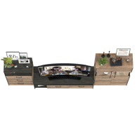 Брутальный декор и контрастная кромка, как и лицевая фурнитура придаёт мебели индустриальную эстетику. Комплектация состоит из тумбы под ТВ Трувор 13.70, комода с ящиками Трувор 13.307.02 и комода с витриной Трувор 13.306. Тумба Трувор 13.70 оснащена широкой нишей сверху и 2 выдвижными ящиками и небольшой нишей снизу. Столешница тумбы имеет по центру кабель-канал, что значительно упрощает подключение техники и проблемы с проводами. Тумба под ТВ Трувор 13.70 имеет универсальную сборку, что позволяет расположить ящики как справа, так и слева. Аккуратный комод оснащен 3 выдвижными ящиками и открытой нишей сверху. Направляющие выдвижных ящиков скрытого монтажа оснащены доводчиками, что обеспечивают повышенный комфорт и надёжность. На нижних кромках опор предусмотрены пластиковые подпятники для защиты поверхности пола от механических повреждений. Металлические элементы делают эту мебель надёжной, аутентичной и функциональной. За распашными дверками комода со стеклянными вставками расположены 3 полки. Центральная часть комода имеет витрину с подсветкой. Светодиодная подсветка в витрине со стеклом — эффектно подчёркивает аксессуары. На нижних кромках опор комода предусмотрены пластиковые подпятники для защиты поверхности пола от механических повреждений. Четырёхшарнирные петли дверей оснащены доводчиками, что обеспечивают повышенный комфорт и надёжность. Выполнена мебель из ламинированной ДСП 16 мм и металлических элементов, торцы окромлены ПХВ плёнкой 0,4 мм. В производстве мебели использована современная фурнитура, отличающаяся высокой надёжностью и долговечностью. Поставляется в разобранном виде в надёжной упаковке, с комплектом сборочной фурнитуры и инструкцией по сборке.