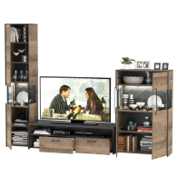 Брутальный декор и контрастная кромка, как и лицевая фурнитура придаёт мебели индустриальную эстетику. Комплектация состоит из тумбы под ТВ Трувор 13.70, комода с витриной Трувор 13.306 и шкафа-пенала с витриной Трувор 13.205. Тумба Трувор 13.70 оснащена широкой нишей сверху и 2 выдвижными ящиками и небольшой нишей снизу. Столешница тумбы имеет по центру кабель-канал, что значительно упрощает подключение техники и проблемы с проводами. Тумба под ТВ Трувор 13.70 имеет универсальную сборку, что позволяет расположить ящики как справа, так и слева. За распашными дверками комода со стеклянными вставками расположены 3 полки. Центральная часть комода имеет витрину с подсветкой. Светодиодная подсветка в витрине со стеклом — эффектно подчёркивает аксессуары. Шкаф-пенал Трувор 13.205 за распашной дверкой со стеклянной вставкой расположены 5 полочек, 2 из которых съемные. Пенал имеет витрину с подсветкой. Светодиодная подсветка в витрине со стеклом — эффектно подчёркивает аксессуары. Шкаф-пенал с витриной имеет универсальную сборку, сторону открывания двери Вы определяете при сборке. Четырёхшарнирные петли двери оснащены доводчиками, что обеспечивают повышенный комфорт и надёжность. Направляющие выдвижных ящиков скрытого монтажа оснащены доводчиками, что обеспечивают повышенный комфорт и надёжность. На нижних кромках опор предусмотрены пластиковые подпятники для защиты поверхности пола от механических повреждений. Металлические элементы делают эту мебель надёжной, аутентичной и функциональной. Выполнена мебель из ламинированной ДСП 16 мм и металлических элементов, торцы окромлены ПХВ плёнкой 0,4 мм. В производстве мебели использована современная фурнитура, отличающаяся высокой надёжностью и долговечностью. Поставляется в разобранном виде в надёжной упаковке, с комплектом сборочной фурнитуры и инструкцией по сборке.