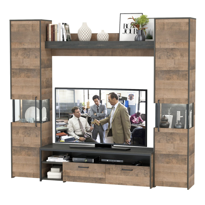 Брутальный декор и контрастная кромка, как и лицевая фурнитура придаёт мебели индустриальную эстетику. Комплектация состоит из тумбы под ТВ Трувор 13.70, полки навесной Трувор 15.60 и двух шкафов-пеналов с витринами Трувор 13.205. Тумба Трувор 13.70 оснащена широкой нишей сверху и 2 выдвижными ящиками и небольшой нишей снизу. Столешница тумбы имеет по центру кабель-канал, что значительно упрощает подключение техники и проблемы с проводами. Тумба под ТВ Трувор 13.70 имеет универсальную сборку, что позволяет расположить ящики как справа, так и слева. Классическая навесная открытая полка с задней панелью расположена над тумбой. Полка располагается по центру панели и оборудована бортиком. Полку Трувор 15.60 можно использовать как книжную, а также для размещения элементов декора, поделок и фоторгафий. Полка имеет с обратной стороны панели скрытые крепленния. Максимальная нагрузка на полку составляет 3 кг. Шкаф-пенал Трувор 13.205 за распашной дверкой со стеклянной вставкой расположены 5 полочек, 2 из которых съемные. В комп. 2 шкафа-пенала. Пенал имеет витрину с подсветкой. Светодиодная подсветка в витрине со стеклом — эффектно подчёркивает аксессуары. Шкаф-пенал с витриной имеет универсальную сборку, сторону открывания двери Вы определяете при сборке. Четырёхшарнирные петли двери оснащены доводчиками, что обеспечивают повышенный комфорт и надёжность. Направляющие выдвижных ящиков скрытого монтажа оснащены доводчиками, что обеспечивают повышенный комфорт и надёжность. На нижних кромках опор предусмотрены пластиковые подпятники для защиты поверхности пола от механических повреждений. Металлические элементы делают эту мебель надёжной, аутентичной и функциональной. Выполнена мебель из ламинированной ДСП 16 мм и металлических элементов, торцы окромлены ПХВ плёнкой 0,4 мм. В производстве мебели использована современная фурнитура, отличающаяся высокой надёжностью и долговечностью. Поставляется в разобранном виде в надёжной упаковке, с комплектом сборочной фурнитуры и инструкцией по сборке.