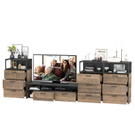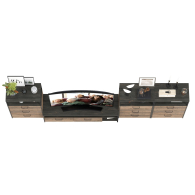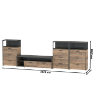 Брутальный декор и контрастная кромка, как и лицевая фурнитура придаёт мебели индустриальную эстетику. Комплектация состоит из тумбы под ТВ Трувор 13.70 и трех комодов с ящиками Трувор 13.307.02. Тумба Трувор 13.70 оснащена широкой нишей сверху и 2 выдвижными ящиками и небольшой нишей снизу. Столешница тумбы имеет по центру кабель-канал, что значительно упрощает подключение техники и проблемы с проводами. Тумба под ТВ Трувор 13.70 имеет универсальную сборку, что позволяет расположить ящики как справа, так и слева. Аккуратный комод оснащен 3 выдвижными ящиками и открытой нишей сверху. В комп. 3 ед.. Направляющие выдвижных ящиков скрытого монтажа оснащены доводчиками, что обеспечивают повышенный комфорт и надёжность. На нижних кромках опор предусмотрены пластиковые подпятники для защиты поверхности пола от механических повреждений. Металлические элементы делают эту мебель надёжной, аутентичной и функциональной. Выполнена мебель из ламинированной ДСП 16 мм и металлических элементов, торцы окромлены ПХВ плёнкой 0,4 мм. В производстве мебели использована современная фурнитура, отличающаяся высокой надёжностью и долговечностью. Поставляется в разобранном виде в надёжной упаковке, с комплектом сборочной фурнитуры и инструкцией по сборке.