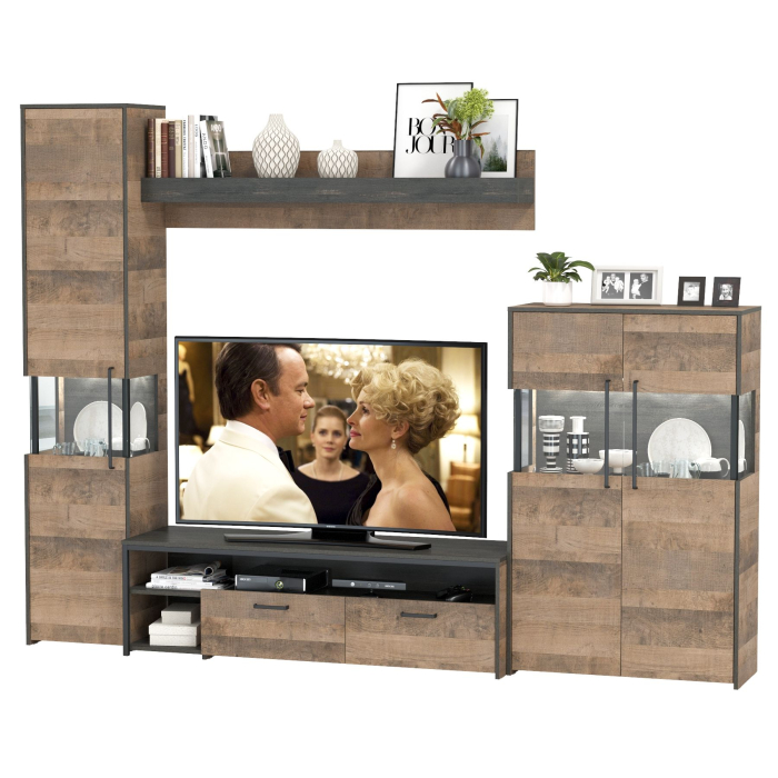 Брутальный декор и контрастная кромка, как и лицевая фурнитура придаёт мебели индустриальную эстетику. Комплектация состоит из тумбы под ТВ Трувор 13.70, полки навесной Трувор 15.60, комода с витриной Трувор 13.306 и шкафа-пенала с витриной Трувор 13.205. Тумба Трувор 13.70 оснащена широкой нишей сверху и 2 выдвижными ящиками и небольшой нишей снизу. Столешница тумбы имеет по центру кабель-канал, что значительно упрощает подключение техники и проблемы с проводами. Тумба под ТВ Трувор 13.70 имеет универсальную сборку, что позволяет расположить ящики как справа, так и слева. Классическая навесная открытая полка с задней панелью расположена над тумбой. Полка располагается по центру панели и оборудована бортиком. Полку Трувор 15.60 можно использовать как книжную, а также для размещения элементов декора, поделок и фоторгафий. Полка имеет с обратной стороны панели скрытые крепленния. Максимальная нагрузка на полку составляет 3 кг. За распашными дверками комода со стеклянными вставками расположены 3 полки. Центральная часть комода имеет витрину с подсветкой. Светодиодная подсветка в витрине со стеклом — эффектно подчёркивает аксессуары. Шкаф-пенал Трувор 13.205 за распашной дверкой со стеклянной вставкой расположены 5 полочек, 2 из которых съемные. Пенал имеет витрину с подсветкой. Светодиодная подсветка в витрине со стеклом — эффектно подчёркивает аксессуары. Шкаф-пенал с витриной имеет универсальную сборку, сторону открывания двери Вы определяете при сборке. Четырёхшарнирные петли двери оснащены доводчиками, что обеспечивают повышенный комфорт и надёжность. Направляющие выдвижных ящиков скрытого монтажа оснащены доводчиками, что обеспечивают повышенный комфорт и надёжность. На нижних кромках опор предусмотрены пластиковые подпятники для защиты поверхности пола от механических повреждений. Металлические элементы делают эту мебель надёжной, аутентичной и функциональной. Выполнена мебель из ламинированной ДСП 16 мм и металлических элементов, торцы окромлены ПХВ плёнкой 0,4 мм. В производстве мебели использована современная фурнитура, отличающаяся высокой надёжностью и долговечностью. Поставляется в разобранном виде в надёжной упаковке, с комплектом сборочной фурнитуры и инструкцией по сборке.