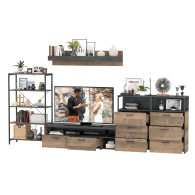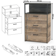 Брутальный декор и контрастная кромка, как и лицевая фурнитура придаёт мебели индустриальную эстетику. Комплектация состоит из тумбы под ТВ Трувор 13.70, полки навесной Трувор 15.60, стеллажа Трувор 13.151.01 и двух комодов с ящиками Трувор 13.307.02. Тумба Трувор 13.70 оснащена широкой нишей сверху и 2 выдвижными ящиками и небольшой нишей снизу. Столешница тумбы имеет по центру кабель-канал, что значительно упрощает подключение техники и проблемы с проводами. Тумба под ТВ Трувор 13.70 имеет универсальную сборку, что позволяет расположить ящики как справа, так и слева. Классическая навесная открытая полка с задней панелью расположена над тумбой. Полка располагается по центру панели и оборудована бортиком. Полку Трувор 15.60 можно использовать как книжную, а также для размещения элементов декора, поделок и фоторгафий. Полка имеет с обратной стороны панели скрытые крепленния. Максимальная нагрузка на полку составляет 3 кг. Аккуратный комод оснащен 3 выдвижными ящиками и открытой нишей сверху. В комп. 2 ед.. Устойчивый стеллаж Трувор 13.151.01 с 4 полками с возможность доступа с любой стороны. Металлические стойки с регулируемыми опорами. Использование крестовых металлических стяжек вместо задней стенки делает конструкцию лёгкой, воздушной и устойчивой к боковым нагрузкам. Направляющие выдвижных ящиков скрытого монтажа оснащены доводчиками, что обеспечивают повышенный комфорт и надёжность. На нижних кромках опор предусмотрены пластиковые подпятники для защиты поверхности пола от механических повреждений. Металлические элементы делают эту мебель надёжной, аутентичной и функциональной. Выполнена мебель из ламинированной ДСП 16 мм и металлических элементов, торцы окромлены ПХВ плёнкой 0,4 мм. В производстве мебели использована современная фурнитура, отличающаяся высокой надёжностью и долговечностью. Поставляется в разобранном виде в надёжной упаковке, с комплектом сборочной фурнитуры и инструкцией по сборке.