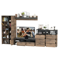 Брутальный декор и контрастная кромка, как и лицевая фурнитура придаёт мебели индустриальную эстетику. Комплектация состоит из тумбы под ТВ Трувор 13.70, полки навесной Трувор 15.60, двух комодов с ящиками Трувор 13.307.02 и шкафа-стеллажа Трувор 13.206. Тумба Трувор 13.70 оснащена широкой нишей сверху и 2 выдвижными ящиками и небольшой нишей снизу. Столешница тумбы имеет по центру кабель-канал, что значительно упрощает подключение техники и проблемы с проводами. Тумба под ТВ Трувор 13.70 имеет универсальную сборку, что позволяет расположить ящики как справа, так и слева. Классическая навесная открытая полка с задней панелью расположена над тумбой. Полка располагается по центру панели и оборудована бортиком. Полку Трувор 15.60 можно использовать как книжную, а также для размещения элементов декора, поделок и фоторгафий. Полка имеет с обратной стороны панели скрытые крепленния. Максимальная нагрузка на полку составляет 3 кг. Аккуратный комод оснащен 3 выдвижными ящиками и открытой нишей сверху. В комп. 2 ед.. Шкаф-стеллаж состоит из двух отделений - с одной стороны с дверкой, с другой с открытыми полками. За распашной дверкой расположены 4 полки, дверь оборудована широкой ручкой. Открытое отделение с открытыми имеет сверху и снизу большие ниши и по центру 6 ниш поменьше. Шкаф-стеллаж Трувор 13.206 имеет универсальную сборку, сторону открывания двери и ее расположение Вы определяете при сборке. Четырёхшарнирные петли двери оснащены доводчиками, что обеспечивают повышенный комфорт и надёжность. Направляющие выдвижных ящиков скрытого монтажа оснащены доводчиками, что обеспечивают повышенный комфорт и надёжность. На нижних кромках опор предусмотрены пластиковые подпятники для защиты поверхности пола от механических повреждений. Металлические элементы делают эту мебель надёжной, аутентичной и функциональной. Выполнена мебель из ламинированной ДСП 16 мм и металлических элементов, торцы окромлены ПХВ плёнкой 0,4 мм. В производстве мебели использована современная фурнитура, отличающаяся высокой надёжностью и долговечностью. Поставляется в разобранном виде в надёжной упаковке, с комплектом сборочной фурнитуры и инструкцией по сборке.
