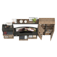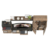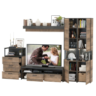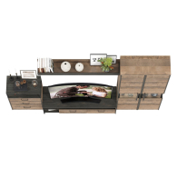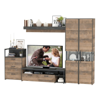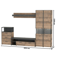 Брутальный декор и контрастная кромка, как и лицевая фурнитура придаёт мебели индустриальную эстетику. Комплектация состоит из тумбы под ТВ Трувор 13.70, полки навесной Трувор 15.60, комода с ящиками Трувор 13.307.02 и двух шкафов-пеналов с витринами Трувор 13.205. Тумба Трувор 13.70 оснащена широкой нишей сверху и 2 выдвижными ящиками и небольшой нишей снизу. Столешница тумбы имеет по центру кабель-канал, что значительно упрощает подключение техники и проблемы с проводами. Тумба под ТВ Трувор 13.70 имеет универсальную сборку, что позволяет расположить ящики как справа, так и слева. Классическая навесная открытая полка с задней панелью расположена над тумбой. Полка располагается по центру панели и оборудована бортиком. Полку Трувор 15.60 можно использовать как книжную, а также для размещения элементов декора, поделок и фоторгафий. Полка имеет с обратной стороны панели скрытые крепленния. Максимальная нагрузка на полку составляет 3 кг. Аккуратный комод оснащен 3 выдвижными ящиками и открытой нишей сверху. Шкаф-пенал Трувор 13.205 за распашной дверкой со стеклянной вставкой расположены 5 полочек, 2 из которых съемные. В комп. 2 шкафа-пенала. Пенал имеет витрину с подсветкой. Светодиодная подсветка в витрине со стеклом — эффектно подчёркивает аксессуары. Шкаф-пенал с витриной имеет универсальную сборку, сторону открывания двери Вы определяете при сборке. Четырёхшарнирные петли двери оснащены доводчиками, что обеспечивают повышенный комфорт и надёжность. Направляющие выдвижных ящиков скрытого монтажа оснащены доводчиками, что обеспечивают повышенный комфорт и надёжность. На нижних кромках опор предусмотрены пластиковые подпятники для защиты поверхности пола от механических повреждений. Металлические элементы делают эту мебель надёжной, аутентичной и функциональной. Выполнена мебель из ламинированной ДСП 16 мм и металлических элементов, торцы окромлены ПХВ плёнкой 0,4 мм. В производстве мебели использована современная фурнитура, отличающаяся высокой надёжностью и долговечностью. Поставляется в разобранном виде в надёжной упаковке, с комплектом сборочной фурнитуры и инструкцией по сборке.