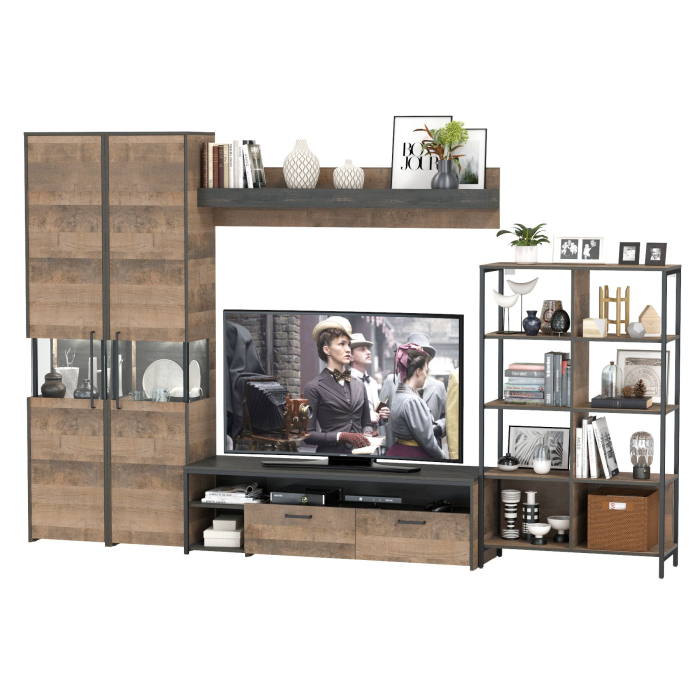 Брутальный декор и контрастная кромка, как и лицевая фурнитура придаёт мебели индустриальную эстетику. Комплектация состоит из тумбы под ТВ Трувор 13.70, полки навесной Трувор 15.60, стеллажа Трувор 13.151.02 и двух шкафов-пеналов с витринами Трувор 13.205. Тумба Трувор 13.70 оснащена широкой нишей сверху и 2 выдвижными ящиками и небольшой нишей снизу. Столешница тумбы имеет по центру кабель-канал, что значительно упрощает подключение техники и проблемы с проводами. Тумба под ТВ Трувор 13.70 имеет универсальную сборку, что позволяет расположить ящики как справа, так и слева. Классическая навесная открытая полка с задней панелью расположена над тумбой. Полка располагается по центру панели и оборудована бортиком. Полку Трувор 15.60 можно использовать как книжную, а также для размещения элементов декора, поделок и фоторгафий. Полка имеет с обратной стороны панели скрытые крепленния. Максимальная нагрузка на полку составляет 3 кг. Стеллаж Трувор 13.151.02 с 8 полками, верхние 6 с возможность доступа с любой стороны. Нижняя ниша имеют заднюю панель. Металлические стойки с регулируемыми опорами. Шкаф-пенал Трувор 13.205 за распашной дверкой со стеклянной вставкой расположены 5 полочек, 2 из которых съемные. В комп. 2 шкафа-пенала. Пенал имеет витрину с подсветкой. Светодиодная подсветка в витрине со стеклом — эффектно подчёркивает аксессуары. Шкаф-пенал с витриной имеет универсальную сборку, сторону открывания двери Вы определяете при сборке. Четырёхшарнирные петли двери оснащены доводчиками, что обеспечивают повышенный комфорт и надёжность. Направляющие выдвижных ящиков скрытого монтажа оснащены доводчиками, что обеспечивают повышенный комфорт и надёжность. На нижних кромках опор предусмотрены пластиковые подпятники для защиты поверхности пола от механических повреждений. Металлические элементы делают эту мебель надёжной, аутентичной и функциональной. Выполнена мебель из ламинированной ДСП 16 мм и металлических элементов, торцы окромлены ПХВ плёнкой 0,4 мм. В производстве мебели использована современная фурнитура, отличающаяся высокой надёжностью и долговечностью. Поставляется в разобранном виде в надёжной упаковке, с комплектом сборочной фурнитуры и инструкцией по сборке.