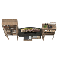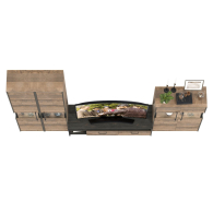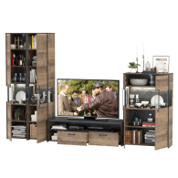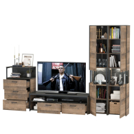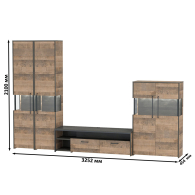 Брутальный декор и контрастная кромка, как и лицевая фурнитура придаёт мебели индустриальную эстетику. Комплектация состоит из тумбы под ТВ Трувор 13.70, комода с витриной Трувор 13.306 и двух шкафов-пеналов с витринами Трувор 13.205. Тумба Трувор 13.70 оснащена широкой нишей сверху и 2 выдвижными ящиками и небольшой нишей снизу. Столешница тумбы имеет по центру кабель-канал, что значительно упрощает подключение техники и проблемы с проводами. Тумба под ТВ Трувор 13.70 имеет универсальную сборку, что позволяет расположить ящики как справа, так и слева. За распашными дверками комода со стеклянными вставками расположены 3 полки. Центральная часть комода имеет витрину с подсветкой. Светодиодная подсветка в витрине со стеклом — эффектно подчёркивает аксессуары. Шкаф-пенал Трувор 13.205 за распашной дверкой со стеклянной вставкой расположены 5 полочек, 2 из которых съемные. В комп. 2 шкафа-пенала. Пенал имеет витрину с подсветкой. Светодиодная подсветка в витрине со стеклом — эффектно подчёркивает аксессуары. Шкаф-пенал с витриной имеет универсальную сборку, сторону открывания двери Вы определяете при сборке. Четырёхшарнирные петли двери оснащены доводчиками, что обеспечивают повышенный комфорт и надёжность. Направляющие выдвижных ящиков скрытого монтажа оснащены доводчиками, что обеспечивают повышенный комфорт и надёжность. На нижних кромках опор предусмотрены пластиковые подпятники для защиты поверхности пола от механических повреждений. Металлические элементы делают эту мебель надёжной, аутентичной и функциональной. Выполнена мебель из ламинированной ДСП 16 мм и металлических элементов, торцы окромлены ПХВ плёнкой 0,4 мм. В производстве мебели использована современная фурнитура, отличающаяся высокой надёжностью и долговечностью. Поставляется в разобранном виде в надёжной упаковке, с комплектом сборочной фурнитуры и инструкцией по сборке.