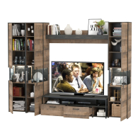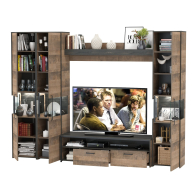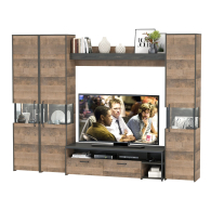 Брутальный декор и контрастная кромка, как и лицевая фурнитура придаёт мебели индустриальную эстетику. Комплектация состоит из тумбы под ТВ Трувор 13.70, полки навесной Трувор 15.60 и трех шкафов-пеналов с витринами Трувор 13.205. Тумба Трувор 13.70 оснащена широкой нишей сверху и 2 выдвижными ящиками и небольшой нишей снизу. Столешница тумбы имеет по центру кабель-канал, что значительно упрощает подключение техники и проблемы с проводами. Тумба под ТВ Трувор 13.70 имеет универсальную сборку, что позволяет расположить ящики как справа, так и слева. Классическая навесная открытая полка с задней панелью расположена над тумбой. Полка располагается по центру панели и оборудована бортиком. Полку Трувор 15.60 можно использовать как книжную, а также для размещения элементов декора, поделок и фоторгафий. Полка имеет с обратной стороны панели скрытые крепленния. Максимальная нагрузка на полку составляет 3 кг. Шкаф-пенал Трувор 13.205 за распашной дверкой со стеклянной вставкой расположены 5 полочек, 2 из которых съемные. В комп. 3 шкафа-пенала. Пенал имеет витрину с подсветкой. Светодиодная подсветка в витрине со стеклом — эффектно подчёркивает аксессуары. Шкаф-пенал с витриной имеет универсальную сборку, сторону открывания двери Вы определяете при сборке. Направляющие выдвижных ящиков скрытого монтажа оснащены доводчиками, что обеспечивают повышенный комфорт и надёжность. На нижних кромках опор предусмотрены пластиковые подпятники для защиты поверхности пола от механических повреждений. Четырёхшарнирные петли двери оснащены доводчиками, что обеспечивают повышенный комфорт и надёжность. Выполнена мебель из ламинированной ДСП 16 мм и металлических элементов, торцы окромлены ПХВ плёнкой 0,4 мм. В производстве мебели использована современная фурнитура, отличающаяся высокой надёжностью и долговечностью. Поставляется в разобранном виде в надёжной упаковке, с комплектом сборочной фурнитуры и инструкцией по сборке.