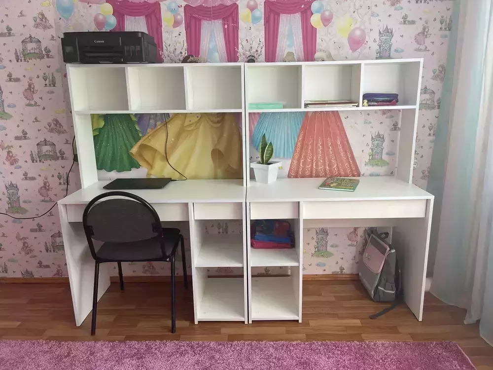 Удобная, устойчивая конструкция располагает большими столешницами и вместительной системой хранения для двоих деток. Система хранения каждого стола разнообразна - это надстройка с открытыми нишами, открытая тумба со съёмной полкой и два выдвижных ящика стола. Защитная ниша надстройки вполне достаточна для установки монитора любого размера, а тумба подойдёт для установки системного блока. Нарядный стол компьютерный Комфорт 12.77F с множество открытых ниш, визуально лёгкий, привлекает эргономичностью и стильным дизайном. Стол компьютерный для двоих детей Комфорт 12.77F собираются на любую сторону - при сборке Вы можете расположить тумбу как слева, так и справа.