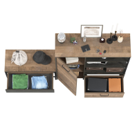 Брутальный декор и контрастная кромка, как и лицевая фурнитура придаёт мебели индустриальную эстетику. Комплектация состоит из комода с дверкой Трувор 13.307.01 и обувницы с сиденьем Трувор 13.241.03. Вместительный комод Трувор 13.307.01 оснащен двумя полками за распашной дверкой с одной стороны и тремя открытыми нишами и выдвижным ящиком снизу с другой. Комод 13.307.01 имеет универсальную сборку, что позволяет расположить дверку как справа, так и слева. Металлические элементы делают этот комод надёжным, аутентичным и функциональным. Низкая обувница Трувор 13.241.03 на 3 пары обуви с выдвижным ящиком для хранения различных принадлежностей и мелких предметов. Вместо боковых стоек использованы металлические опоры. Снизу металлическая подставка для обуви. Тумбу можно использовать в качестве подставки для сумок или банкетки для переобувания. Металлические опоры и подставка для обуви делают эту мебель надёжной, аутентичной и функциональной. Направляющие выдвижных ящиков скрытого монтажа и четырёхшарнирные петли оснащены доводчиками, что обеспечивает повышенный комфорт и надёжность.