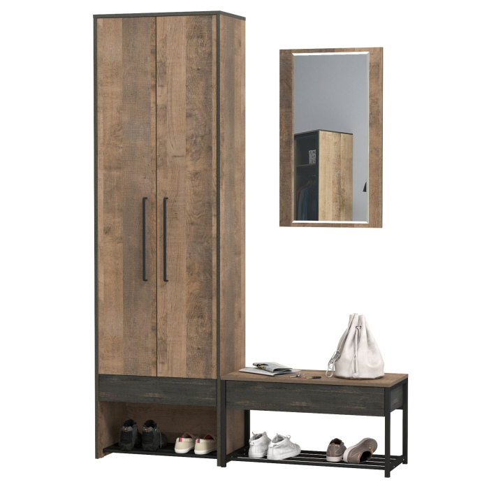 Брутальный декор и контрастная кромка, как и лицевая фурнитура придаёт мебели индустриальную эстетику. Комплектация состоит из шкафа для одежды Трувор 13.328.0, обувницы с сиденьем Трувор 13.241.03 и зеркала навесного Трувор 15.30. Двустворчатый шкаф Трувор 13.328.02 за дверками которого располагается антресольная полка и выдвижная штанга для одежды на плечиках. Снизу под отделением с дверками расположен выдвижной ящик и ниша для 3 пар обуви с металлической решеткой-подставкой. Низкая обувница Трувор 13.241.03 на 3 пары обуви с выдвижным ящиком для хранения различных принадлежностей и мелких предметов. Вместо боковых стоек использованы металлические опоры. Снизу металлическая подставка для обуви. Тумбу можно использовать в качестве подставки для сумок или банкетки для переобувания. Металлические опоры и подставка для обуви делают эту мебель надёжной, аутентичной и функциональной. На нижних кромках опор предусмотрены пластиковые подпятники для защиты поверхности пола от механических повреждений. Направляющие выдвижных ящиков скрытого монтажа и четырёхшарнирные петли оснащены доводчиками, что обеспечивает повышенный комфорт и надёжность. Классическое прямоугольное навесное зеркало Трувор 15.30 на панели из ЛДСП. Согласно Ваших запросов при установке зеркало возможно повесить как горизонтально, так и вертикально. Размер зеркала позволяет ему стать частью множества композиций. Зеркало 15.30 имеет декоративный скос фаски под углом по всему периметру полотна. Скрытые крепежи на задней поверхности и предусматривают выбор расположения зеркала.