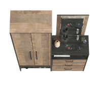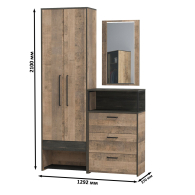 Брутальный декор и контрастная кромка, как и лицевая фурнитура придаёт мебели индустриальную эстетику. Комплектация состоит из шкафа для одежды Трувор 13.328.02, комода с ящиками Трувор 13.307.02 и зеркала навесного Трувор 15.30. Двустворчатый шкаф Трувор 13.328.02 за дверками которого располагается антресольная полка и выдвижная штанга для одежды на плечиках. Снизу под отделением с дверками расположен выдвижной ящик и ниша для 3 пар обуви с металлической решеткой-подставкой. Вместительный и аккуратный комод Трувор 13.307.02 оснащен тремя выжвижными ящиками и открытой нишей сверху. На нижних кромках опор предусмотрены пластиковые подпятники для защиты поверхности пола от механических повреждений. Направляющие выдвижных ящиков скрытого монтажа и четырёхшарнирные петли оснащены доводчиками, что обеспечивает повышенный комфорт и надёжность. Металлические элементы делают этот комод надёжным, аутентичным и функциональным. Классическое прямоугольное навесное зеркало Трувор 15.30 на панели из ЛДСП. Согласно Ваших запросов при установке зеркало возможно повесить как горизонтально, так и вертикально. Размер зеркала позволяет ему стать частью множества композиций. Зеркало 15.30 имеет декоративный скос фаски под углом по всему периметру полотна. Скрытые крепежи на задней поверхности и предусматривают выбор расположения зеркала.