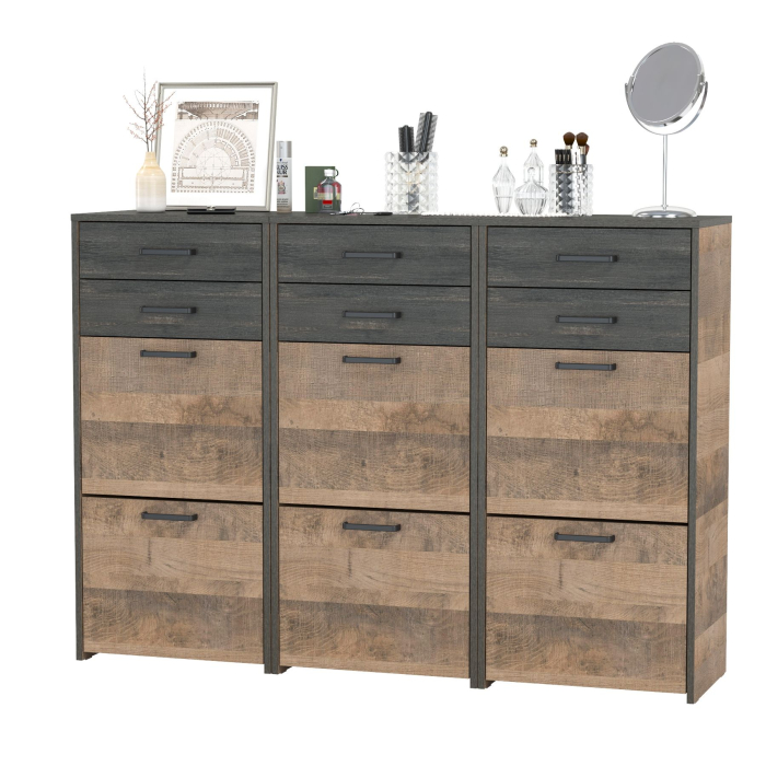 Брутальный декор и контрастная кромка, как и лицевая фурнитура придаёт мебели индустриальную эстетику. Комплектация состоит из трех тумб для обуви высоких Трувор 13.241.06. В комплектации 3 высоких обувницы. Каждая с двумя откидными дверками на 8 пар обуви и двумя выдвижными ящиками для хранения различных принадлежностей и мелких предметов.