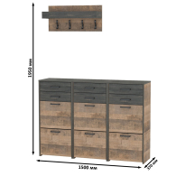 Брутальный декор и контрастная кромка, как и лицевая фурнитура придаёт мебели индустриальную эстетику. Комплектация состоит из трех тумб для обуви высоких Трувор 13.241.06 и навесной вешалки Трувор 15.04. В комплектации 3 высоких обувницы. Каждая с двумя откидными дверками на 8 пар обуви и двумя выдвижными ящиками для хранения различных принадлежностей и мелких предметов. Направляющие выдвижных ящиков скрытого монтажа оснащены доводчиками, что обеспечивает повышенный комфорт и надёжность. На нижних кромках опор предусмотрены пластиковые подпятники для защиты поверхности пола от механических повреждений. Навесная вешалка Трувор 15.04 с четырьмя двухрожковыми крючками и полкой. Полка для головных уборов оборудованна бортиком. Максимальная нагрузка на каждый кручек - 1,5 кг, на полку - 3 кг. Вешалка рассчитана для малогаборитных помещений (прихожих, балконов), по приемлемой цене.