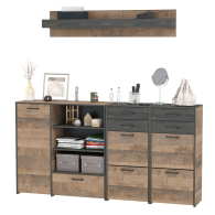 Брутальный декор и контрастная кромка, как и лицевая фурнитура придаёт мебели индустриальную эстетику. Комплектация состоит из двух тумб для обуви высоких Трувор 13.241.06, комода с дверкой Трувор 13.307.01 и полки Трувор 15.60. Вместительный комод Трувор 13.307.01 оснащен двумя полками за распашной дверкой с одной стороны и тремя открытыми нишами и выдвижным ящиком снизу с другой. Комод 13.307.01 имеет универсальную сборку, что позволяет расположить дверку как справа, так и слева. Металлические элементы делают этот комод надёжным, аутентичным и функциональным. В комплектации 2 высоких обувницы. Каждая с двумя откидными дверками на 8 пар обуви и двумя выдвижными ящиками для хранения различных принадлежностей и мелких предметов. На нижних кромках опор предусмотрены пластиковые подпятники для защиты поверхности пола от механических повреждений. Направляющие выдвижных ящиков скрытого монтажа и четырёхшарнирные петли оснащены доводчиками, что обеспечивает повышенный комфорт и надёжность. Классическая навесная открытая полка Трувор 15.60 с задней панелью. Полка располагается по центру панели и оборудована бортиком. Полку 15.60 можно использовать как книжную, а также для размещения элементов декора, поделок и фоторгафий. Полка имеет с обратной стороны панели скрытые крепленния. Максимальная нагрузка на полку составляет 3 кг.