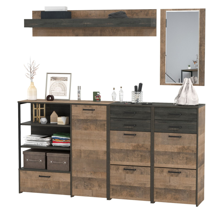 Брутальный декор и контрастная кромка, как и лицевая фурнитура придаёт мебели индустриальную эстетику. Комплектация состоит из двух тумб для обуви высоких Трувор 13.241.06, комода с дверкой Трувор 13.307.01, полки Трувор 15.60 и зеркала навесного Трувор 15.30. Вместительный комод Трувор 13.307.01 оснащен двумя полками за распашной дверкой с одной стороны и тремя открытыми нишами и выдвижным ящиком снизу с другой. Комод 13.307.01 имеет универсальную сборку, что позволяет расположить дверку как справа, так и слева. Металлические элементы делают этот комод надёжным, аутентичным и функциональным. В комплектации 2 высоких обувницы. Каждая с двумя откидными дверками на 8 пар обуви и двумя выдвижными ящиками для хранения различных принадлежностей и мелких предметов. На нижних кромках опор предусмотрены пластиковые подпятники для защиты поверхности пола от механических повреждений. Направляющие выдвижных ящиков скрытого монтажа и четырёхшарнирные петли оснащены доводчиками, что обеспечивает повышенный комфорт и надёжность. Классическое прямоугольное навесное зеркало Трувор 15.30 на панели из ЛДСП. Согласно Ваших запросов при установке зеркало возможно повесить как горизонтально, так и вертикально. Размер зеркала позволяет ему стать частью множества композиций. Зеркало 15.30 имеет декоративный скос фаски под углом по всему периметру полотна. Скрытые крепежи на задней поверхности и предусматривают выбор расположения зеркала. Классическая навесная открытая полка Трувор 15.60 с задней панелью. Полка располагается по центру панели и оборудована бортиком. Полку 15.60 можно использовать как книжную, а также для размещения элементов декора, поделок и фотографий. Полка имеет с обратной стороны панели скрытые крепления. Максимальная нагрузка на полку составляет 3 кг.