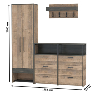 Брутальный декор и контрастная кромка, как и лицевая фурнитура придаёт мебели индустриальную эстетику. Комплектация состоит из шкафа для одежды Трувор 13.328.02, двух комодов с ящиками Трувор 13.307.02 и навесной вешалки Трувор 15.04. Двустворчатый шкаф Трувор 13.328.02 за дверками которого располагается антресольная полка и выдвижная штанга для одежды на плечиках. Снизу под отделением с дверками расположен выдвижной ящик и ниша для 3 пар обуви с металлической решеткой-подставкой. В комплектации 2 комода Трувор 13.307.02. Каждый оснащен тремя выжвижными ящиками и открытой нишей сверху. Металлические элементы делают этот комод надёжным, аутентичным и функциональным. На нижних кромках опор предусмотрены пластиковые подпятники для защиты поверхности пола от механических повреждений. Направляющие выдвижных ящиков скрытого монтажа и четырёхшарнирные петли оснащены доводчиками, что обеспечивает повышенный комфорт и надёжность. Навесная вешалка Трувор 15.04 с четырьмя двухрожковыми крючками и полкой. Полка для головных уборов оборудованна бортиком. Максимальная нагрузка на каждый кручек - 1,5 кг, на полку - 3 кг. Вешалка рассчитана для малогаборитных помещений (прихожих, балконов), по приемлемой цене.