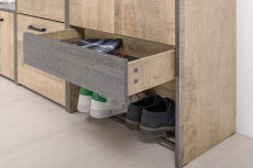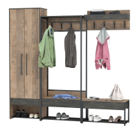 Брутальный декор и контрастная кромка, как и лицевая фурнитура придаёт мебели индустриальную эстетику. Комплектация состоит из шкафа для одежды Трувор 13.328.02, прихожей Трувор 15.120, обувницы с сиденьем Трувор 13.241.03 и навесной вешалки Трувор 15.04. Двустворчатый шкаф Трувор 13.328.02 за дверками которого располагается антресольная полка и выдвижная штанга для одежды на плечиках. Снизу под отделением с дверками расположен выдвижной ящик и ниша для 3 пар обуви с металлической решеткой-подставкой. В верхней части прихожей Трувор 15.120 расположены четыре двухрожковых крючка. В нижней части полка которую можно использовать в качестве подставки для сумок или банкетки для переобувания. Под полкой расположен выдвижной ящик и ниша для 4 пар обуви с металлической решеткой-подставкой. Металлические стойки и решетка-подставка делают эту прихожую надёжной, аутентичной и функциональной. Низкая обувница Трувор 13.241.03 на 3 пары обуви с выдвижным ящиком для хранения различных принадлежностей и мелких предметов. Вместо боковых стоек использованы металлические опоры. Снизу металлическая подставка для обуви. Тумбу можно использовать в качестве подставки для сумок или банкетки для переобувания. Металлические опоры и подставка для обуви делают эту мебель надёжной, аутентичной и функциональной. Направляющие выдвижных ящиков скрытого монтажа и четырёхшарнирные петли оснащены доводчиками, что обеспечивает повышенный комфорт и надёжность. На нижних кромках опор предусмотрены пластиковые подпятники для защиты поверхности пола от механических повреждений. Навесная вешалка Трувор 15.04 с четырьмя двухрожковыми крючками и полкой. Полка для головных уборов оборудованна бортиком. Максимальная нагрузка на каждый кручек - 1,5 кг, на полку - 3 кг. Вешалка рассчитана для малогаборитных помещений (прихожих, балконов), по приемлемой цене.