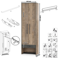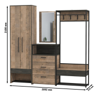 Брутальный декор и контрастная кромка, как и лицевая фурнитура придаёт мебели индустриальную эстетику. Комплектация состоит из шкафа для одежды Трувор 13.328.02, прихожей Трувор 15.120, комода с ящиками Трувор 13.307.02 и зеркала навесного Трувор 15.30. Двустворчатый шкаф Трувор 13.328.02 за дверками которого располагается антресольная полка и выдвижная штанга для одежды на плечиках. Снизу под отделением с дверками расположен выдвижной ящик и ниша для 3 пар обуви с металлической решеткой-подставкой. В верхней части прихожей Трувор 15.120 расположены четыре двухрожковых крючка. В нижней части полка которую можно использовать в качестве подставки для сумок или банкетки для переобувания. Под полкой расположен выдвижной ящик и ниша для 4 пар обуви с металлической решеткой-подставкой. Металлические стойки и решетка-подставка делают эту прихожую надёжной, аутентичной и функциональной. Вместительный и аккуратный комод Трувор 13.307.02 оснащен тремя выжвижными ящиками и открытой нишей сверху. Направляющие выдвижных ящиков скрытого монтажа и четырёхшарнирные петли оснащены доводчиками, что обеспечивает повышенный комфорт и надёжность. На нижних кромках опор предусмотрены пластиковые подпятники для защиты поверхности пола от механических повреждений. Классическое прямоугольное навесное зеркало Трувор 15.30 на панели из ЛДСП. Согласно Ваших запросов при установке зеркало возможно повесить как горизонтально, так и вертикально. Размер зеркала позволяет ему стать частью множества композиций. Зеркало 15.30 имеет декоративный скос фаски под углом по всему периметру полотна. Скрытые крепежи на задней поверхности и предусматривают выбор расположения зеркала.