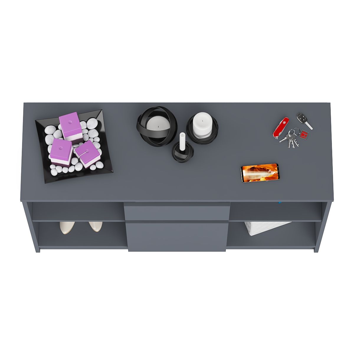 Тумба состоит из двух открытых ниш по бокам и ящика и закрытой нишей по центру. Все ниши имеет полочку по середине. На тумбе достаточно места для размещения телевизора дигональю 47 дюймов. Можно использовать как ТВ тумбу, так и обычную для хранения и размещения Ваших вещей. Продуманная конструкция позволяет убрать лишние предметы, тем самым сохраняя единый стиль оформления помещения. Отсутствие ручек главное преимущество данной модели. Роль ручек выполняют сами фасады. Открывание ящика и двери производится за счет пространства между планками и фасадами.