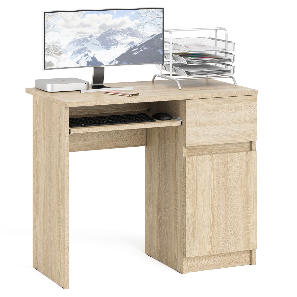 Аккуратный стол компьютерный с тумбой и выдвижной панелью для клавиатуры. Тумба имеет нишу с полочкой за распашной дверкой и выдвижной ящик на роликовых направляющих. Стол компьютерный Мори МС-1 правый не имеет универсальной сборки - выдвижной ящик расположен справа. Продуманная конструкция позволяет убрать лишние предметы, тем самым сохраняя единый стиль оформления помещения. Отсутствие ручек главное преимущество данной модели. Роль ручек выполняют сами фасады. Открывание ящиков и дверки производится за счет пространства между планками и фасадами. Выдвижной ящик на роликовых направляющих L=350 мм. неполного выдвижения обеспечивают комфортную эксплуатацию. На нижних кромках опор предусмотрены пластиковые подпятники для защиты поверхности пола от механических повреждений.