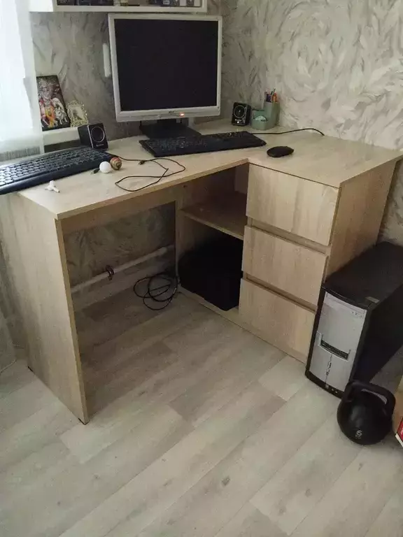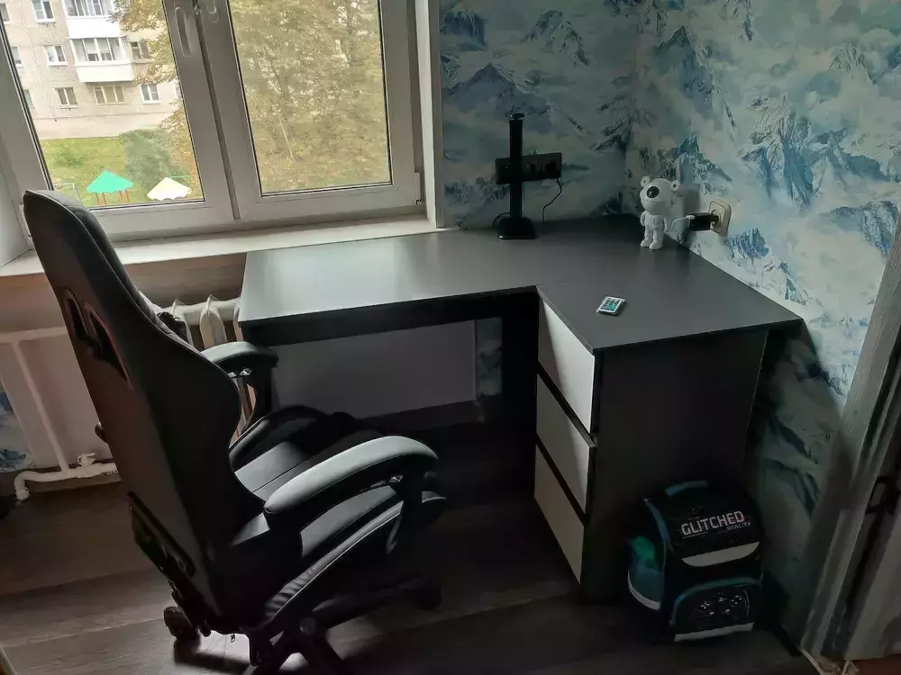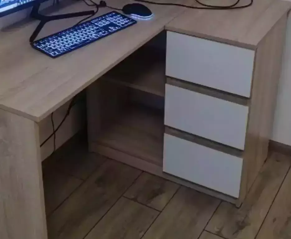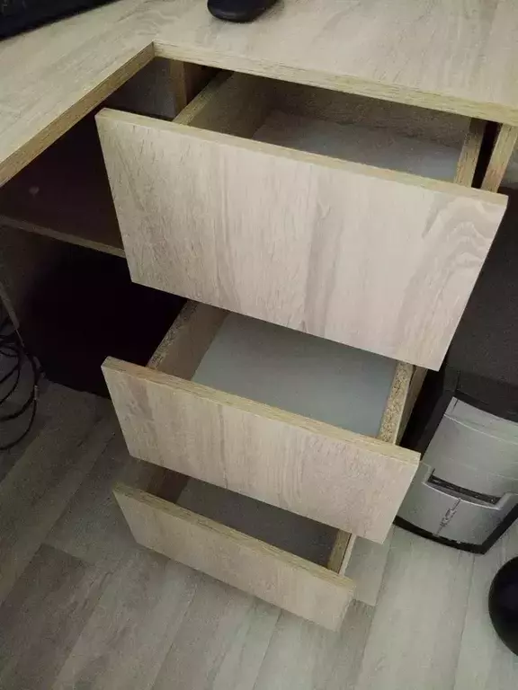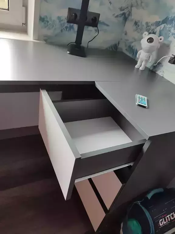 Конструктивно тумба со столешницей образуют угол. Тумба имеет 3 выдвижных ящика и нишу с полкой по середине. Угловой компьютерный стол Мори МС-16 правый не универсален при сборке - тумба с ящиками располагается справа. Продуманная конструкция позволяет убрать лишние предметы, тем самым сохраняя единый стиль оформления помещения. Отсутствие ручек главное преимущество данной модели. Роль ручек выполняют сами фасады. Открывание ящиков производится за счет пространства между планками и фасадами. Выдвижные ящики на роликовых направляющих L=350 мм. неполного выдвижения обеспечивают комфортную эксплуатацию. На нижних кромках опор предусмотрены пластиковые подпятники для защиты поверхности пола от механических повреждений.