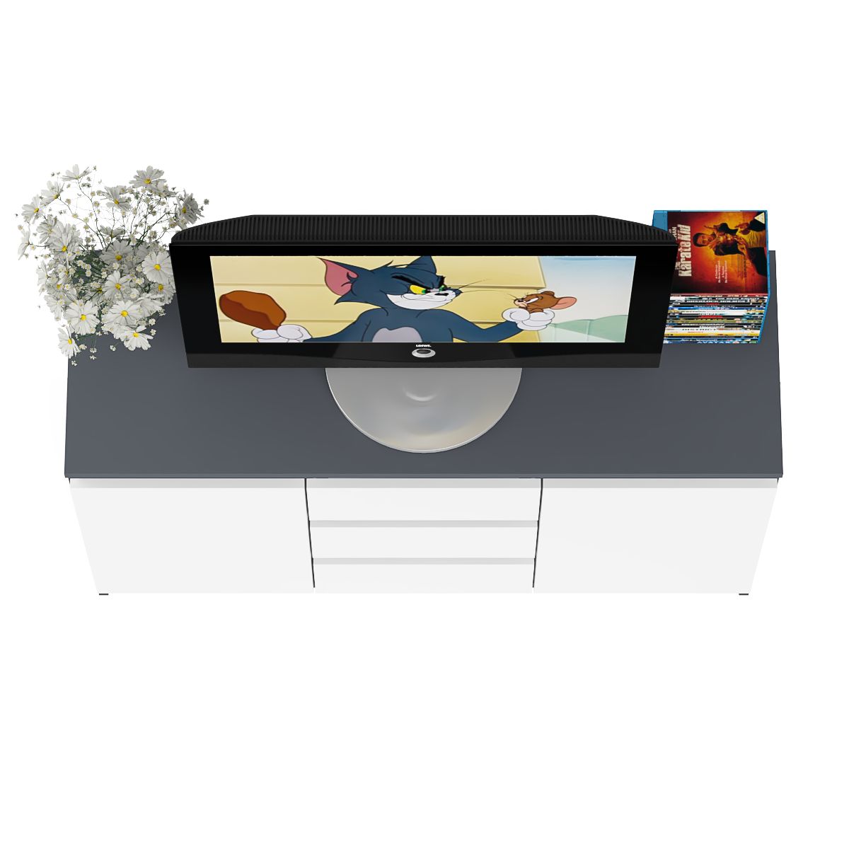 Комод-тумба оборудована по центру тремя выдвижными ящиками и двумя закрытыми отделениями с полками по бокам. Продуманная конструкция позволяет убрать лишние предметы, тем самым сохраняя единый стиль оформления помещения. Отсутствие ручек главное преимущество данной модели. Роль ручек выполняют сами фасады. Открывание ящиков и дверей производится за счет пространства между планками и фасадами. Выдвижные ящики на роликовых направляющих L=350 мм. неполного выдвижения обеспечивают комфортную эксплуатацию. На нижних кромках опор предусмотрены пластиковые подпятники для защиты поверхности пола от механических повреждений.