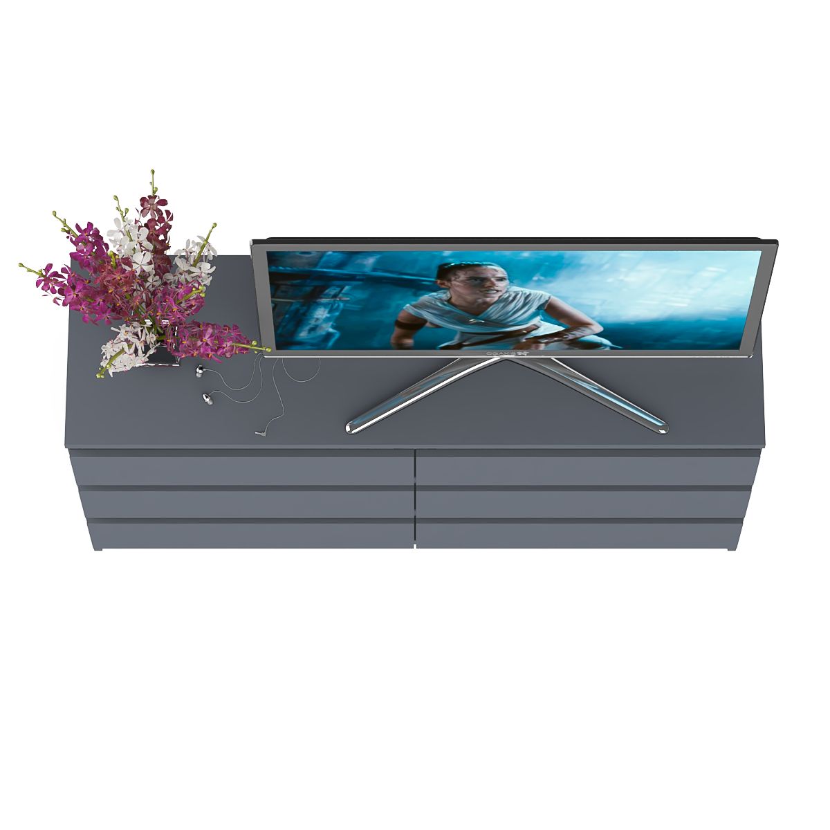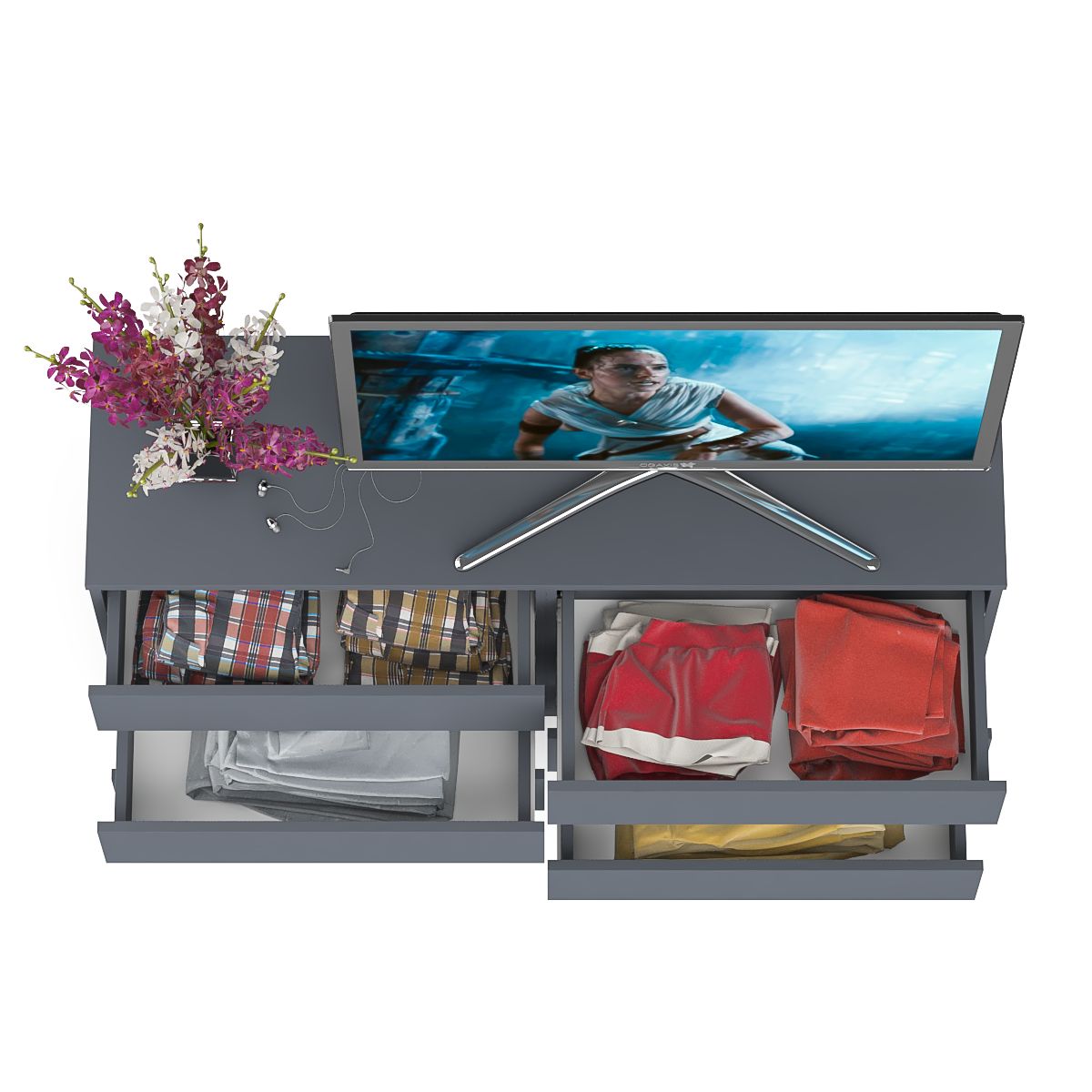 Широкий комод оборудован шестью выдвижными ящиками, расположеными по три в два ряда. Продуманная конструкция позволяет убрать лишние предметы, тем самым сохраняя единый стиль оформления помещения. Отсутствие ручек главное преимущество данной модели. Роль ручек выполняют сами фасады. Открывание ящиков производится за счет пространства между планками и фасадами. Выдвижные ящики на роликовых направляющих L=350 мм. неполного выдвижения обеспечивают комфортную эксплуатацию. На нижних кромках опор предусмотрены пластиковые подпятники для защиты поверхности пола от механических повреждений.