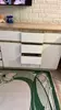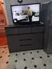 Комод оборудован шестью выдвижными ящиками и двумя закрытыми отделениями с полками. В верхней части комода расположены три ящика, под ними в центре отделение с ещё тремя ящиками и по бокам отделения с дверками. Продуманная конструкция позволяет убрать лишние предметы, тем самым сохраняя единый стиль оформления помещения. Отсутствие ручек главное преимущество данной модели. Роль ручек выполняют сами фасады. Открывание ящиков и дверей производится за счет пространства между планками и фасадами. Выдвижные ящики на роликовых направляющих L=350 мм. неполного выдвижения обеспечивают комфортную эксплуатацию. На нижних кромках опор предусмотрены пластиковые подпятники для защиты поверхности пола от механических повреждений.