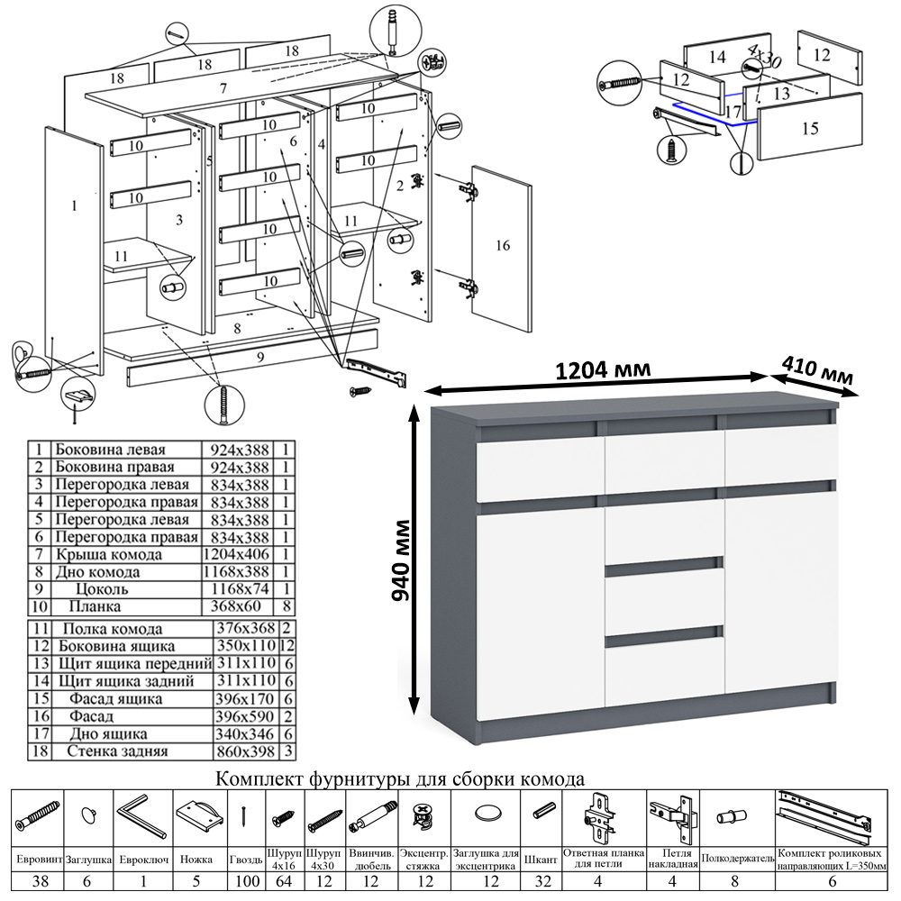 Корпус и фасады изготовлены из экологически чистой ламинированной ДСП 16 мм, торцы окромлены ПХВ плёнкой 0,4 мм. Лицевая фурнитура отсутствует - все фасады открываются за край. Поставляется в разобранном виде в надёжной упаковке, с комплектом сборочной фурнитуры и инструкцией по сборке.